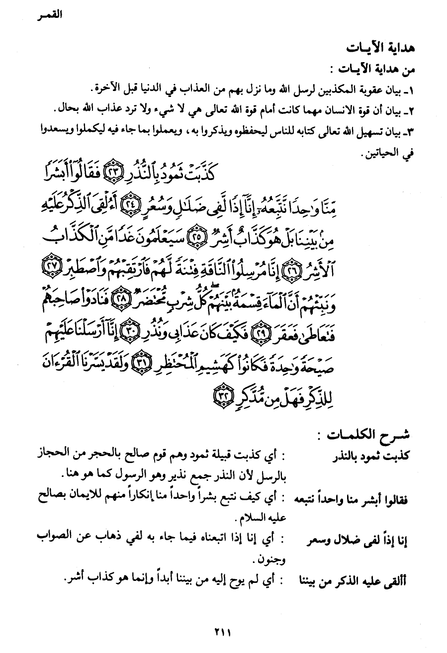 كَذَّبَتْ ثَمُودُ بِالنُّذُرِ (23) فَقَالُوا أَبَشَراً مِنَّا وَاحِداً نَتَّبِعُهُ إِنَّا إِذاً لَفِي ضَلالٍ وَسُعُرٍ (24) أَأُلْقِيَ الذِّكْرُ عَلَيْهِ مِنْ بَيْنِنَا بَلْ هُوَ كَذَّابٌ أَشِرٌ (25) سَيَعْلَمُونَ غَداً مَنِ الْكَذَّابُ الْأَشِرُ (26) إِنَّا مُرْسِلُو الْنَّاقَةِ فِتْنَةً لَهُمْ فَارْتَقِبْهُمْ وَاصْطَبِرْ (27) وَنَبِّئْهُمْ أَنَّ الْمَاءَ قِسْمَةٌ بَيْنَهُمْ كُلُّ شِرْبٍ مُحْتَضَرٌ (28) فَنَادَوْا صَاحِبَهُمْ فَتَعَاطَى فَعَقَرَ (29) فَكَيْفَ كَانَ عَذَابِي وَنُذُرِ (16) إِنَّا أَرْسَلْنَا عَلَيْهِمْ صَيْحَةً وَاحِدَةً فَكَانُوا كَهَشِيمِ الْمُحْتَظِرِ (31) وَلَقَدْ يَسَّرْنَا الْقُرْآنَ لِلذِّكْرِ فَهَلْ مِنْ مُدَّكِرٍ (17)