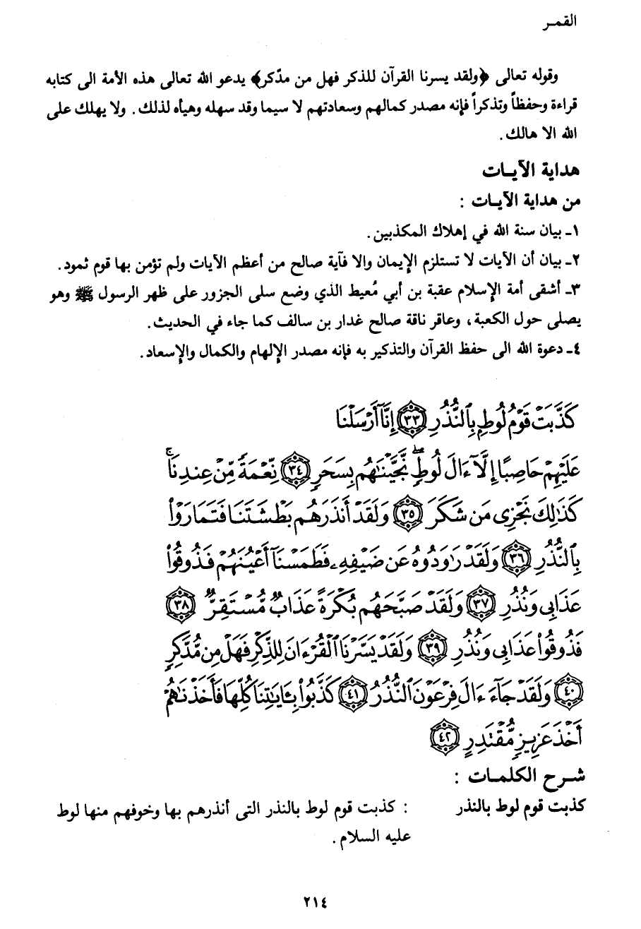 كَذَّبَتْ قَوْمُ لُوطٍ بِالنُّذُرِ (33) إِنَّا أَرْسَلْنَا عَلَيْهِمْ حَاصِباً إِلَّا آلَ لُوطٍ نَجَّيْنَاهُمْ بِسَحَرٍ (34) نِعْمَةً مِنْ عِنْدِنَا كَذَلِكَ نَجْزِي مَنْ شَكَرَ (35) وَلَقَدْ أَنْذَرَهُمْ بَطْشَتَنَا فَتَمَارَوْا بِالنُّذُرِ (36) وَلَقَدْ رَاوَدُوهُ عَنْ ضَيْفِهِ فَطَمَسْنَا أَعْيُنَهُمْ فَذُوقُوا عَذَابِي وَنُذُرِ (37) وَلَقَدْ صَبَّحَهُمْ بُكْرَةً عَذَابٌ مُسْتَقِرٌّ (38) فَذُوقُوا عَذَابِي وَنُذُرِ (39) وَلَقَدْ يَسَّرْنَا الْقُرْآنَ لِلذِّكْرِ فَهَلْ مِنْ مُدَّكِرٍ (40) وَلَقَدْ جَاءَ آلَ فِرْعَوْنَ النُّذُرُ (41) كَذَّبُوا بِآياتِنَا كُلِّهَا فَأَخَذْنَاهُمْ أَخْذَ عَزِيزٍ مُقْتَدِرٍ (42)