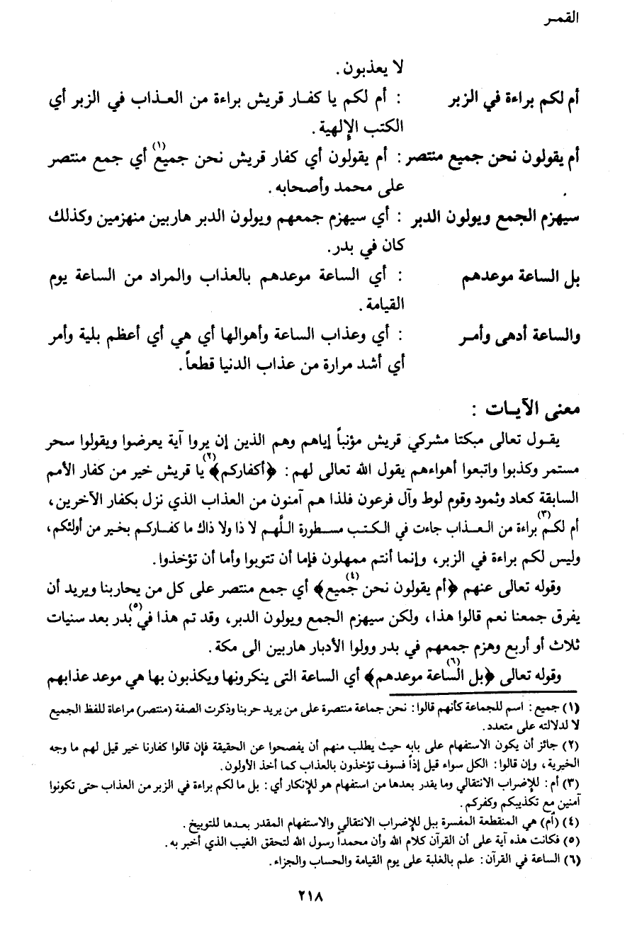 يقول تعالى مبكتا مشركي قريش مؤنباً إياهم وهم الذين إن يروا آية يعرضوا ويقولوا سحر مستمر وكذبوا واتبعوا أهواءهم يقول الله تعالى لهم: {أَكُفَّارُكُمْ2} يا قريش خير من كفار الأمم السابقة كعاد وثمود وقوم لوط وآل فرعون فلذا هم آمنون من العذاب الذي نزل بكفار الآخرين، أم لكم3 براءة من العذاب جاءت في الكتب مسطورة اللهم لا ذا ولا ذاك ما كفاركم بخير من أولئكم، وليس لكم براءة في الزبر، وإنما أنتم ممهلون فإما أن تتوبوا وأما أن تؤخذوا. وقوله تعالى عنهم {أَمْ يَقُولُونَ نَحْنُ جَمِيعٌ4} أي جمه منتصر على كل من يحاربنا ويريد أن يفرق جمعنا نعم قالوا هذا، ولكن سيهزم الجمع ويولون الدبر، وقد تم هذا في5 بدر بعد سنيات ثلاث أو أربع وهزم جمعهم في بدر وولوا الأدبار هاربين إلى مكة. وقوله تعالى {بَلِ السَّاعَةُ6 مَوْعِدُهُمْ} أي الساعة التي ينكرونها ويكذبون بها هي موعد عذابهم