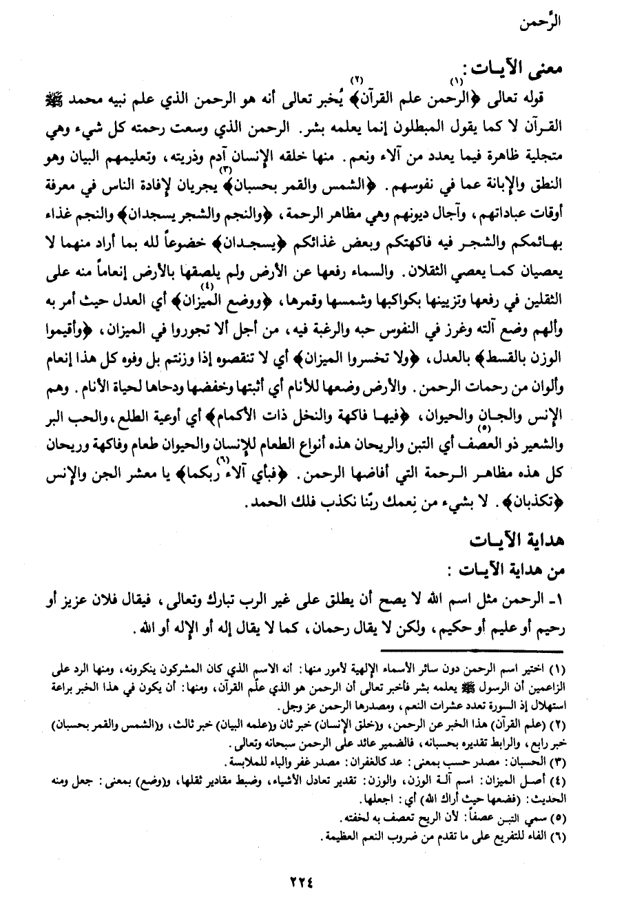 قوله تعالى {الرَّحْمَنُ1 عَلَّمَ الْقُرْآنَ2} يخبر تعالى أنه هو الرحمن الذي علم نبي محمد صَلَّى اللهُ عَلَيْهِ وَسَلَّمَ القرآن لا كما يقول المبطلون إنما يعلمه بشر. الرحمن الذي وسعت رحمته كل شيء وهي متجلية ظاهرة فيما يعدد من آلاء ونعم. منها خلقه الإنسان آدم وذريته، وتعليمهم البيان وهو النطق والإبانة عما في نفوسهم. {الشَّمْسُ وَالْقَمَرُ بِحُسْبَانٍ} 3 يجريان لإفادة الناس في معرفة أوقات عباداتهم، وآجال ديونهم وهي مظاهر الرحمة، {وَالنَّجْمُ وَالشَّجَرُ يَسْجُدَانِ} والنجم غذاء بهائمكم والشجر فيه فاكهتكم وبعض غذائكم {يَسْجُدَانِ} خضوعاً لله بما أراد منهما لا يعصيان كما يعصي الثقلان. والسماء رفعها عن الأرض ولم يلصقها بالأرض إنعاماً منه على الثقلين في رفعها وتزينها بكواكبها وشمسها وقمرها، {وَوَضَعَ الْمِيزَانَ4} أي العدل حيث أمر به وآلهم وضع آلته وغرز في النفوس حبه والرغبة فيه، من أجل ألا تجوروا في الميزان، {وَأَقِيمُوا الْوَزْنَ بِالْقِسْطِ} بالعدل، {وَلا تُخْسِرُوا الْمِيزَانَ} أي لا تنقصوه إذا وزنتم بل وفوه كل هذا إنعام وألوان من رحمات الرحمن. والأرض وضعها للأنام أي أثبتها وخفضها ودحاها لحياة الأنام. وهم الإنس والجان والحيوان، {فِيهَا فَاكِهَةٌ وَالنَّخْلُ ذَاتُ الْأَكْمَامِ} أي أوعية الطلع، والحب البر والشعير ذو العصف5 أي التبن والريحان هذه أنواع الطعام للإنسان والحيوان طعام وفاكهة وريحان كل هذه مظاهر الرحمة التي أفاضها الرحمن.