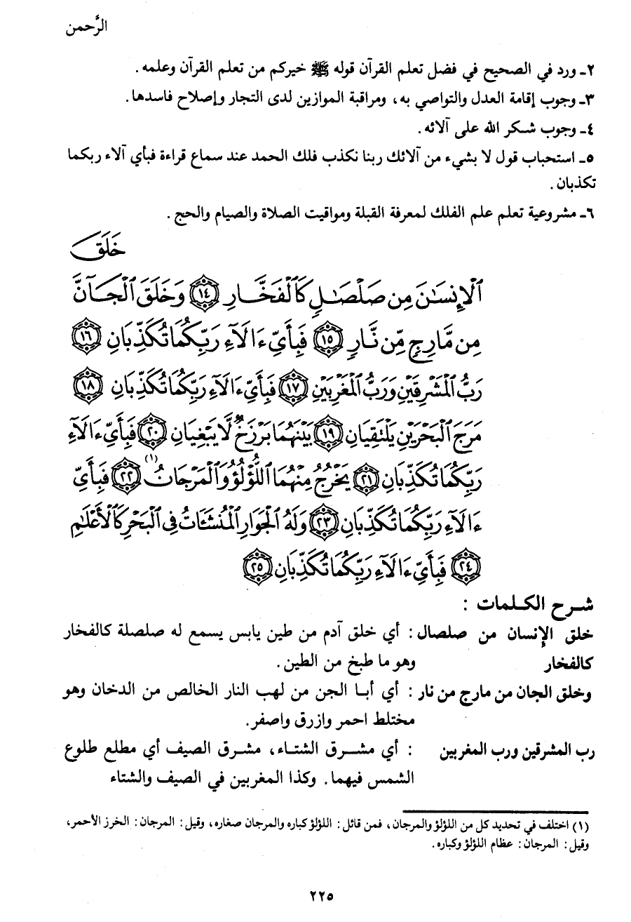 خَلَقَ الْأِنْسَانَ مِنْ صَلْصَالٍ كَالْفَخَّارِ (14) وَخَلَقَ الْجَانَّ مِنْ مَارِجٍ مِنْ نَارٍ (15) فَبِأَيِّ آلاءِ رَبِّكُمَا تُكَذِّبَانِ (16) رَبُّ الْمَشْرِقَيْنِ وَرَبُّ الْمَغْرِبَيْنِ (17) فَبِأَيِّ آلاءِ رَبِّكُمَا تُكَذِّبَانِ (18) مَرَجَ الْبَحْرَيْنِ يَلْتَقِيَانِ (19) بَيْنَهُمَا بَرْزَخٌ لا يَبْغِيَانِ (20) فَبِأَيِّ آلاءِ رَبِّكُمَا تُكَذِّبَانِ (21) يَخْرُجُ مِنْهُمَا اللُّؤْلُؤُ وَالْمَرْجَانُ1 (22) فَبِأَيِّ آلاءِ رَبِّكُمَا تُكَذِّبَانِ (23) وَلَهُ الْجَوَارِ الْمُنْشَآتُ فِي الْبَحْرِ كَالْأَعْلام (24) فَبِأَيِّ آلاءِ رَبِّكُمَا تُكَذِّبَانِ (25)