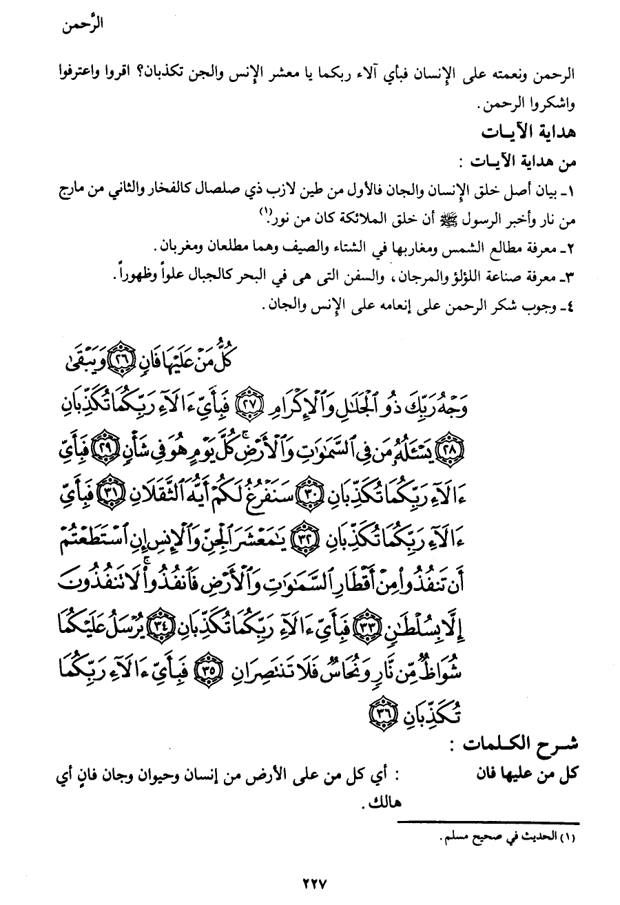 كُلُّ مَنْ عَلَيْهَا فَانٍ (26) وَيَبْقَى وَجْهُ رَبِّكَ ذُو الْجَلالِ وَالْأِكْرَامِ (27) فَبِأَيِّ آلاءِ رَبِّكُمَا تُكَذِّبَانِ (28) يَسْأَلُهُ مَنْ فِي السَّمَاوَاتِ وَالْأَرْضِ كُلَّ يَوْمٍ هُوَ فِي شَأْنٍ (29) فَبِأَيِّ آلاءِ رَبِّكُمَا تُكَذِّبَانِ (30) سَنَفْرُغُ لَكُمْ أَيُّهَا الثَّقَلانِ (31) فَبِأَيِّ آلاءِ رَبِّكُمَا تُكَذِّبَانِ (32) يَا مَعْشَرَ الْجِنِّ وَالْأِنْسِ إِنِ اسْتَطَعْتُمْ أَنْ تَنْفُذُوا مِنْ أَقْطَارِ السَّمَاوَاتِ وَالْأَرْضِ فَانْفُذُوا لا تَنْفُذُونَ إِلَّا بِسُلْطَانٍ (33) فَبِأَيِّ آلاءِ رَبِّكُمَا تُكَذِّبَانِ (34) يُرْسَلُ عَلَيْكُمَا شُوَاظٌ مِنْ نَارٍ وَنُحَاسٌ فَلا تَنْتَصِرَانِ (35) فَبِأَيِّ آلاءِ رَبِّكُمَا تُكَذِّبَانِ (36)