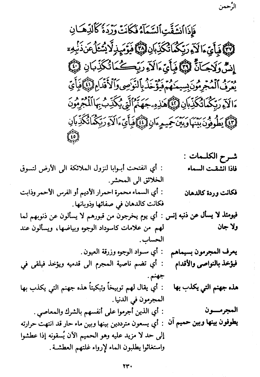 فَإِذَا انْشَقَّتِ السَّمَاءُ فَكَانَتْ وَرْدَةً كَالدِّهَانِ (37) فَبِأَيِّ آلاءِ رَبِّكُمَا تُكَذِّبَانِ (38) فَيَوْمَئِذٍ لا يُسْأَلُ عَنْ ذَنْبِهِ إِنْسٌ وَلا جَانٌّ (39) فَبِأَيِّ آلاءِ رَبِّكُمَا تُكَذِّبَانِ (40) يُعْرَفُ الْمُجْرِمُونَ بِسِيمَاهُمْ فَيُؤْخَذُ بِالنَّوَاصِي وَالْأَقْدَامِ (41) فَبِأَيِّ آلاءِ رَبِّكُمَا تُكَذِّبَانِ (42) هَذِهِ جَهَنَّمُ الَّتِي يُكَذِّبُ بِهَا الْمُجْرِمُونَ (43) يَطُوفُونَ بَيْنَهَا وَبَيْنَ حَمِيمٍ آنٍ (44) فَبِأَيِّ آلاءِ رَبِّكُمَا تُكَذِّبَانِ (45)