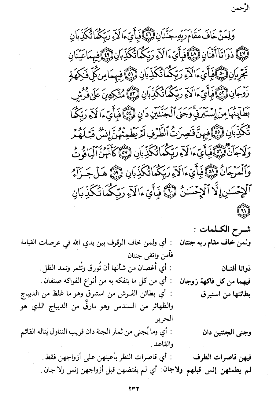 وَلِمَنْ خَافَ مَقَامَ رَبِّهِ جَنَّتَانِ (46) فَبِأَيِّ آلاءِ رَبِّكُمَا تُكَذِّبَانِ (47) ذَوَاتَا أَفْنَانٍ (48) فَبِأَيِّ آلاءِ رَبِّكُمَا تُكَذِّبَانِ (49)
