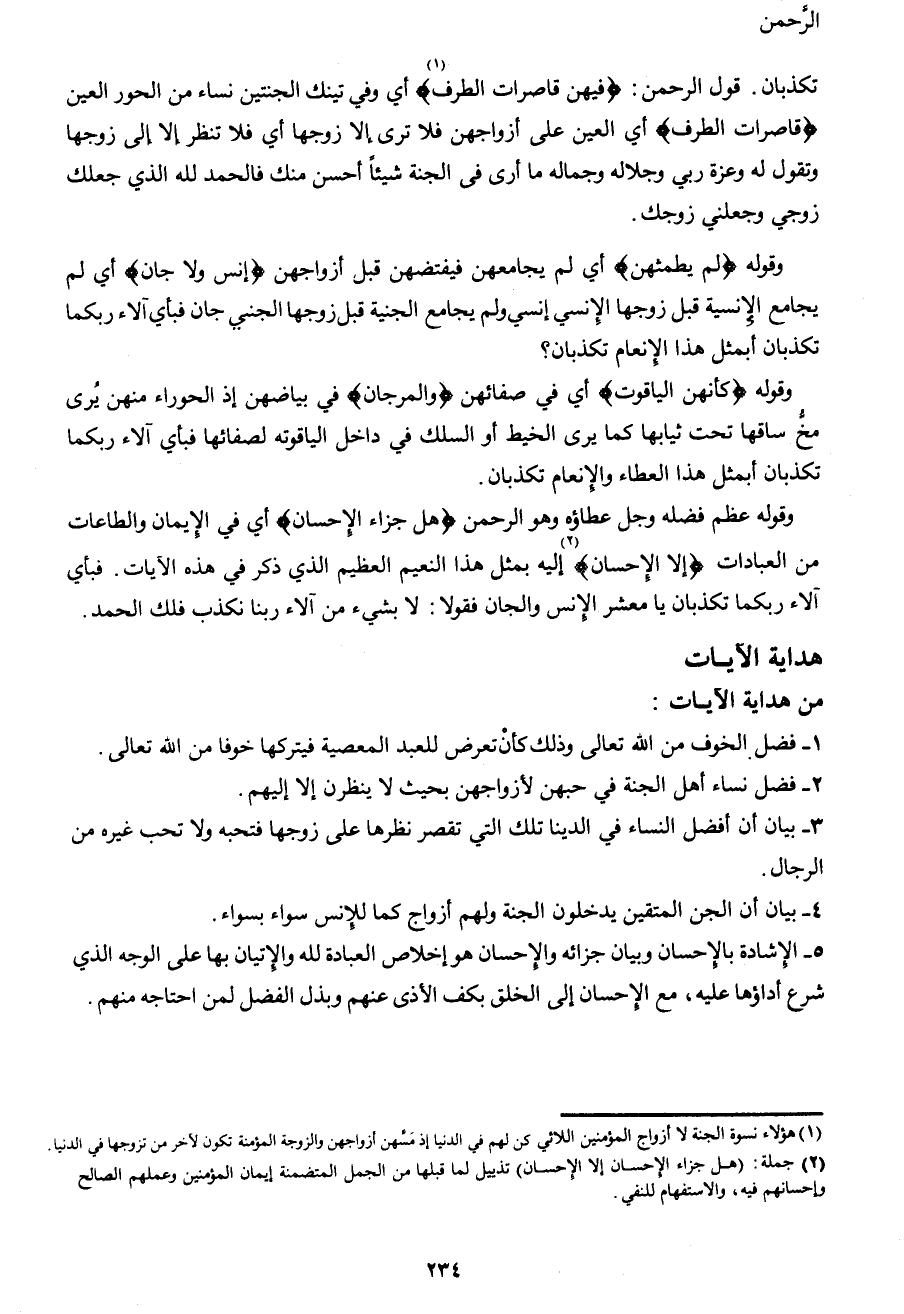 وقوله عظم فضله وجل عطاؤه وهو الرحمن {هَلْ جَزَاءُ الْأِحْسَانِ} أي في الإيمان والطاعات من العبادات {إِلَّا الْإِحْسَانُ} 2 إليه بمثل هذا النعيم العظيم الذي ذكر في هذه الآيات. فبأي آلاء ربكما تكذبان يا معشر الإنس والجان فقولا: لا بشيء من آلاء ربنا نكذب فلك الحمد.