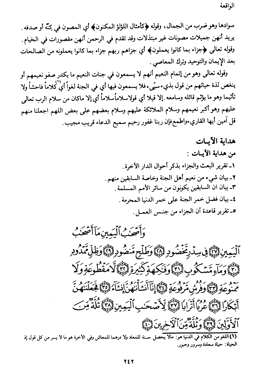 وَأَصْحَابُ الْيَمِينِ مَا أَصْحَابُ الْيَمِينِ (27) فِي سِدْرٍ مَخْضُودٍ (28) وَطَلْحٍ مَنْضُودٍ (29) وَظِلٍّ مَمْدُودٍ (30) وَمَاءٍ مَسْكُوبٍ (31) وَفَاكِهَةٍ كَثِيرَةٍ (32) لا مَقْطُوعَةٍ وَلا مَمْنُوعَةٍ (33) وَفُرُشٍ مَرْفُوعَةٍ (34) إِنَّا أَنْشَأْنَاهُنَّ إِنْشَاءً (35) فَجَعَلْنَاهُنَّ أَبْكَاراً (36) عُرُباً أَتْرَاباً (37) لِأَصْحَابِ الْيَمِينِ (38) ثُلَّةٌ مِنَ الْأَوَّلِينَ (39) وَثُلَّةٌ مِنَ الْآخِرِينَ (40)
