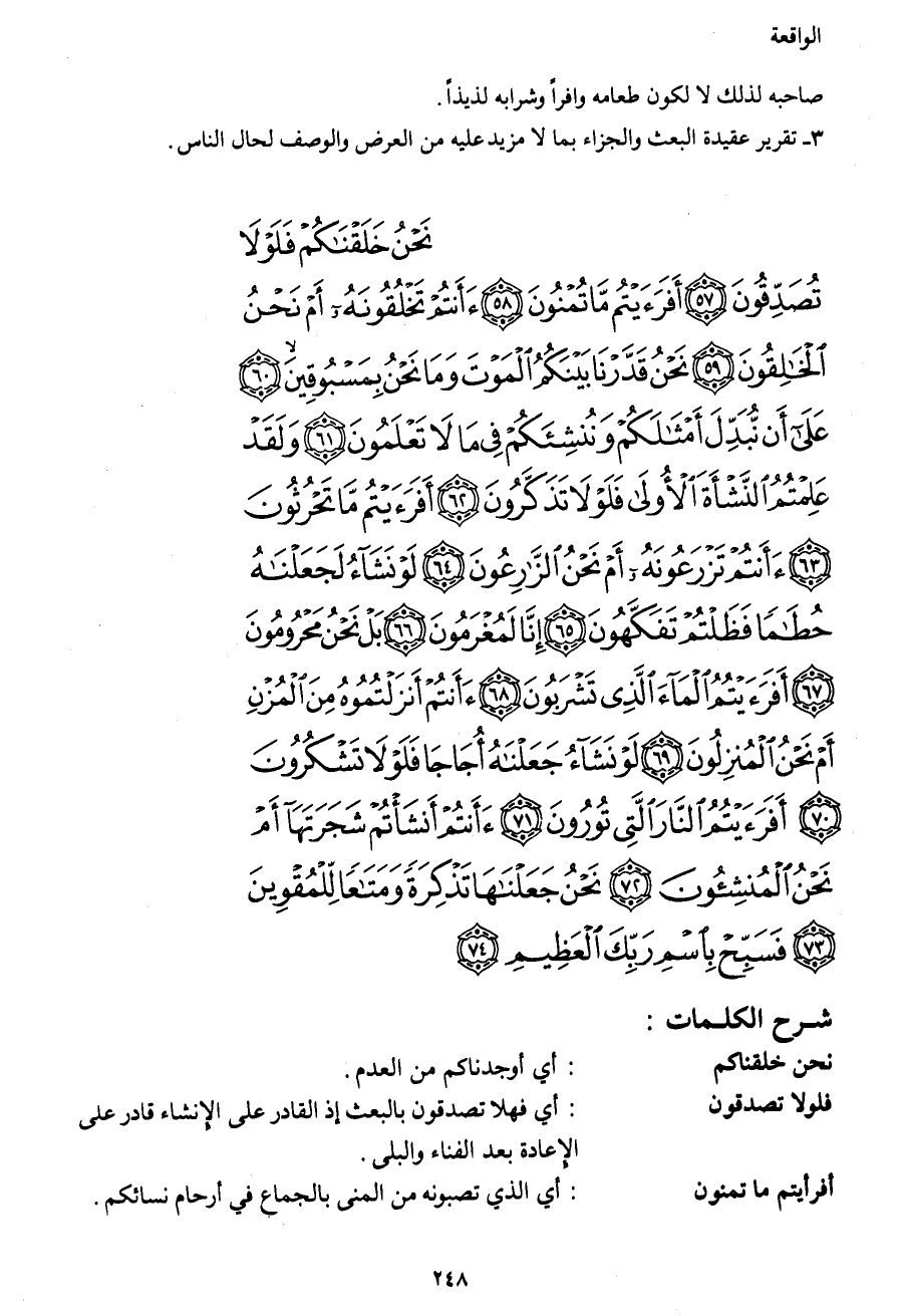 نَحْنُ خَلَقْنَاكُمْ فَلَوْلا تُصَدِّقُونَ (57) أَفَرَأَيْتُمْ مَا تُمْنُونَ (58) أَأَنْتُمْ تَخْلُقُونَهُ أَمْ نَحْنُ الْخَالِقُونَ (59) نَحْنُ قَدَّرْنَا بَيْنَكُمُ الْمَوْتَ وَمَا نَحْنُ بِمَسْبُوقِينَ (60) عَلَى أَنْ نُبَدِّلَ أَمْثَالَكُمْ وَنُنْشِئَكُمْ فِي مَا لا تَعْلَمُونَ (61) وَلَقَدْ عَلِمْتُمُ النَّشْأَةَ الْأُولَى فَلَوْلا تَذَكَّرُونَ (62) أَفَرَأَيْتُمْ مَا تَحْرُثُونَ (63) أَأَنْتُمْ تَزْرَعُونَهُ أَمْ نَحْنُ الزَّارِعُونَ (64) لَوْ نَشَاءُ لَجَعَلْنَاهُ حُطَاماً فَظَلْتُمْ تَفَكَّهُونَ (65) إِنَّا لَمُغْرَمُونَ (66) بَلْ نَحْنُ مَحْرُومُونَ (67) أَفَرَأَيْتُمُ الْمَاءَ الَّذِي تَشْرَبُونَ (68) أَأَنْتُمْ أَنْزَلْتُمُوهُ مِنَ الْمُزْنِ أَمْ نَحْنُ الْمُنْزِلُونَ (69) لَوْ نَشَاءُ جَعَلْنَاهُ أُجَاجاً فَلَوْلا تَشْكُرُونَ (70) أَفَرَأَيْتُمُ النَّارَ الَّتِي تُورُونَ (71) أَأَنْتُمْ أَنْشَأْتُمْ شَجَرَتَهَا أَمْ نَحْنُ الْمُنْشِئُونَ (72) نَحْنُ جَعَلْنَاهَا تَذْكِرَةً وَمَتَاعاً لِلْمُقْوِينَ (73) فَسَبِّحْ بِاسْمِ رَبِّكَ الْعَظِيمِ (74)