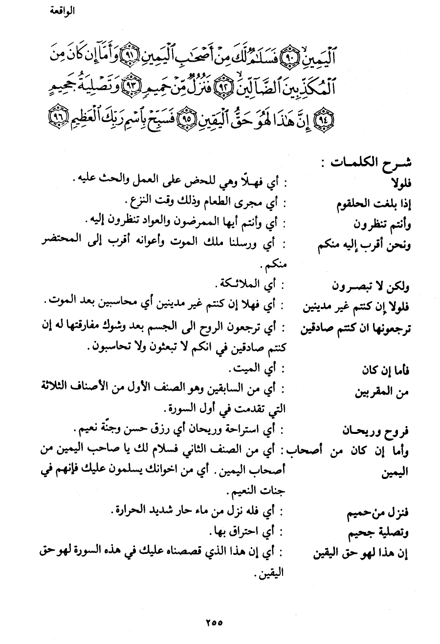 الْيَمِينِ (90) فَسَلامٌ لَكَ مِنْ أَصْحَابِ الْيَمِينِ (91) وَأَمَّا إِنْ كَانَ مِنَ الْمُكَذِّبِينَ الضَّالِّينَ (92) فَنُزُلٌ مِنْ حَمِيمٍ (93) وَتَصْلِيَةُ جَحِيمٍ (94) إِنَّ هَذَا لَهُوَ حَقُّ الْيَقِينِ (95) فَسَبِّحْ بِاسْمِ رَبِّكَ الْعَظِيمِ (96)