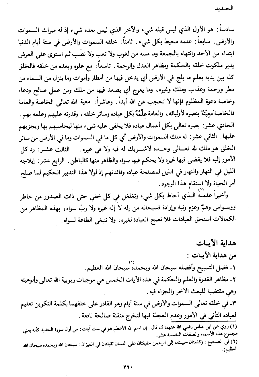سادساً: هو الأول الذي ليس قبله شيء والآخر الذي ليس بعده شيء إذ له ميراث السموات والأرض. سابعاً: علمه محيط بكل شيء. ثامناً: خلقه السموات والأرض في ستة أيام الدنيا ابتداء من الأحد وانتهاء بالجمعة وما مسه من لغوب ولا تعب ولا نصب ثم استوى على العرش يدبر ملكوت خلقه بالحكمة ومظاهر العدل والرحمة. تاسعاً: مع علوه وبعده من خلقه فالخلق كله بين يديه يعلم ما يلج في الأرض أي يدخل فيها من أمطار وأموات وما ينزل من السماء من مطر ورحمة وعذاب وملك وغيره, وما يعرج أي يصعد فيها من ملك ومن عمل صالح ودعاء وخاصة دعوة المظلوم فإنها لا تحجب عن الله أبداً. وعاشراً: معية الله تعالى الخاصة والعامة فالخاصة معيته بنصره لأوليائه, والعامة علمه بكل عباده وسائر خلقه, وقدرته عليهم وعلمه بهم. الحادي عشر: بصره تعالى بكل أعمال عباده فلا يخفى عليه شيء منها ليحاسبهم بها ويجزيهم عليها. الثاني عشر: له ملك السموات والأرض أي كل ما في السموات وما في الأرض من سائر الخلق هو ملك لله تعالى وحده لا شريك له فيه ولا في غيره. الثالث عشر: رد كل الأمور إليه فلا يقضي فيها غيره ولا يحكم فيها سواه والظاهر منها كالباطن. الرابع عشر: إيلاجه الليل في النهار والنهار في الليل لمصلحة عباده وفائدتهم إذ لولا هذا التدبير الحكيم لما صلح أمر الحياة ولا استقام هذا الوجود.