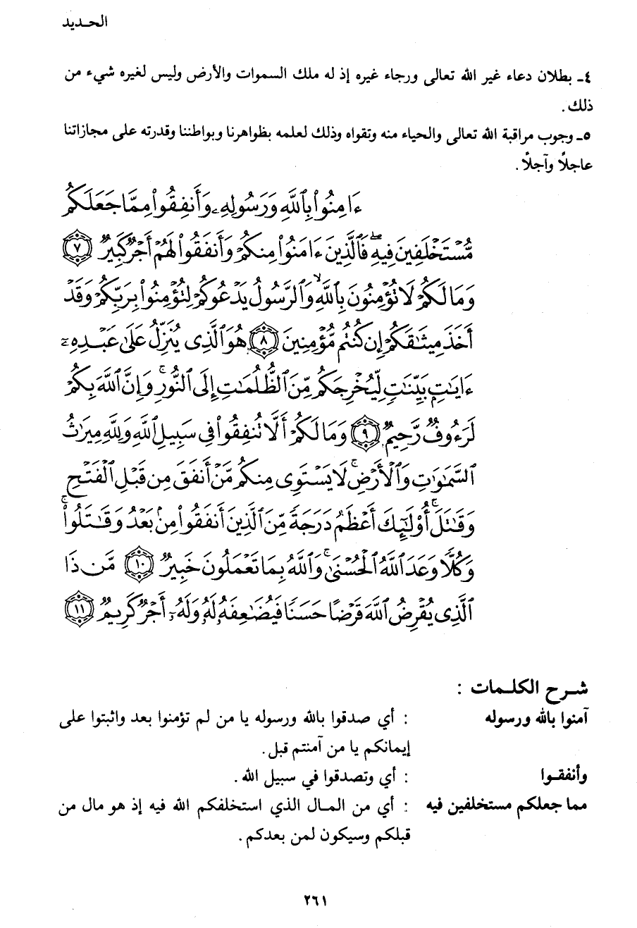 آمِنُوا بِاللهِ وَرَسُولِهِ وَأَنْفِقُوا مِمَّا جَعَلَكُمْ مُسْتَخْلَفِينَ فِيهِ فَالَّذِينَ آمَنُوا مِنْكُمْ وَأَنْفَقُوا لَهُمْ أَجْرٌ كَبِيرٌ (7) وَمَا لَكُمْ لا تُؤْمِنُونَ بِاللهِ وَالرَّسُولُ يَدْعُوكُمْ لِتُؤْمِنُوا بِرَبِّكُمْ وَقَدْ أَخَذَ مِيثَاقَكُمْ إِنْ كُنْتُمْ مُؤْمِنِينَ (8) هُوَ الَّذِي يُنَزِّلُ عَلَى عَبْدِهِ آيَاتٍ بَيِّنَاتٍ لِيُخْرِجَكُمْ مِنَ الظُّلُمَاتِ إِلَى النُّورِ وَإِنَّ اللهَ بِكُمْ لَرَؤُوفٌ رَحِيمٌ (9) وَمَا لَكُمْ أَلَّا تُنْفِقُوا فِي سَبِيلِ اللهِ وَلِلَّهِ مِيرَاثُ السَّمَاوَاتِ وَالْأَرْضِ لا يَسْتَوِي مِنْكُمْ مَنْ أَنْفَقَ مِنْ قَبْلِ الْفَتْحِ وَقَاتَلَ أُولَئِكَ أَعْظَمُ دَرَجَةً مِنَ الَّذِينَ أَنْفَقُوا مِنْ بَعْدُ وَقَاتَلُوا وَكُلّاً وَعَدَ اللهُ الْحُسْنَى وَاللهُ بِمَا تَعْمَلُونَ خَبِيرٌ (10)