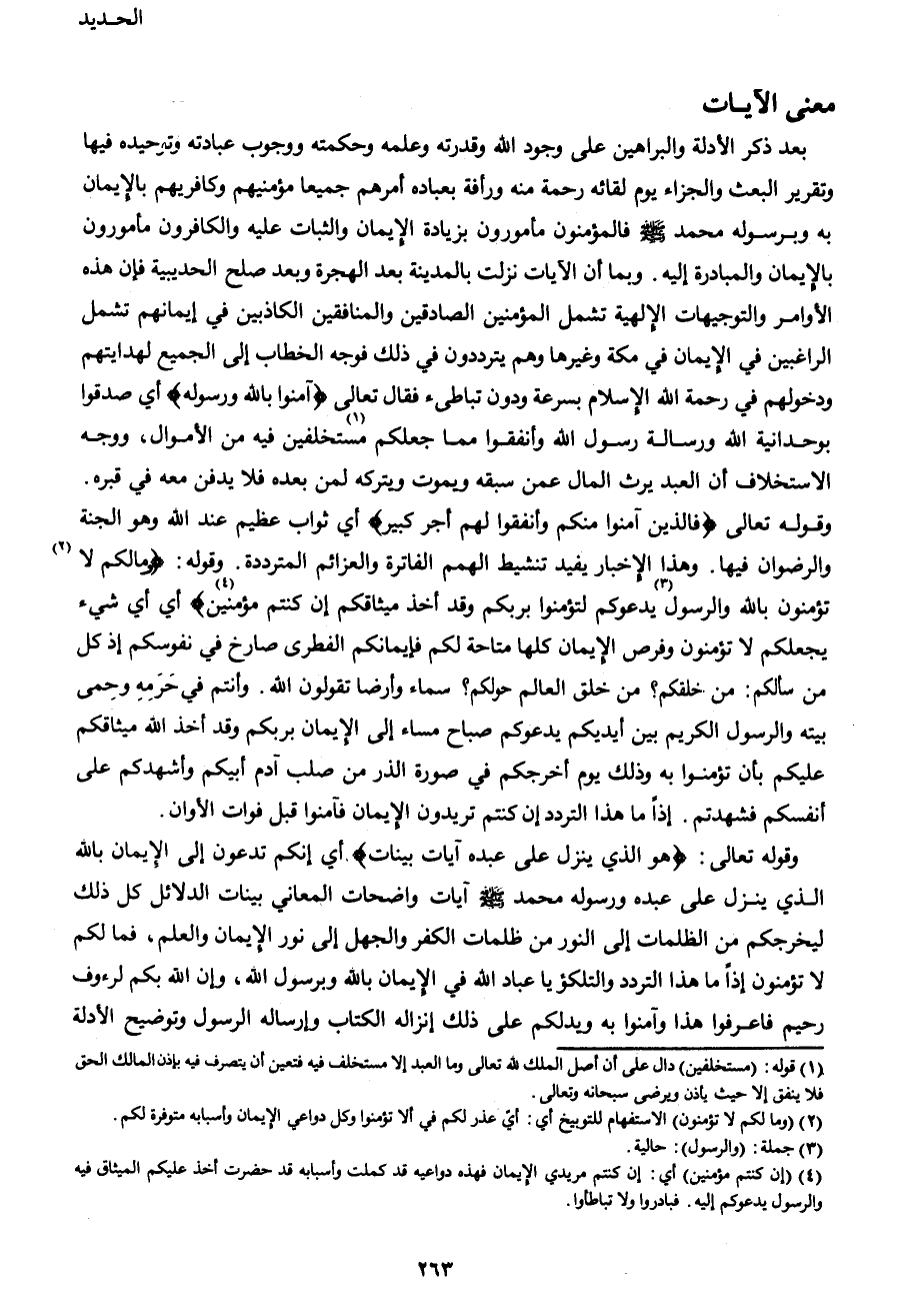 بعد ذكر الأدلة والبراهين على وجود الله وقدرته وعلمه وحكمته ووجوب عبادته وتوحيده فيها وتقرير البعث والجزاء يوم لقائه رحمة منه ورأفة بعباده أمرهم جميعا مؤمنيهم وكافريهم بالإيمان به وبرسوله محمد صَلَّى اللهُ عَلَيْهِ وَسَلَّمَ فالمؤمنون مأمورون بزيادة الإيمان والثبات عليه والكافرون مأمورون بالإيمان والمبادرة إليه. وبما أن الآيات نزلت بالمدينة بعد الهجرة وبعد صلح الحديبية فإن هذه الأوامر والتوجيهات الإلهية تشمل المؤمنين الصادقين والمنافقين الكاذبين في إيمانهم تشمل الراغبين في الإيمان في مكة وغيرها وهم يترددون في ذلك فوجه الخطاب إلى الجميع لهدايتهم ودخولهم في رحمة الله الإسلام بسرعة ودون تباطئ فقال تعالى {آمِنُوا بِاللهِ وَرَسُولِهِ} أي صدقوا بوحدانية الله ورسالة رسول الله وأنفقوا مما جعلكم1 مستخلفين فيه من الأموال, ووجه الاستخلاف أن العبد يرث المال عمن سبقه ويموت ويتركه لمن بعده فلا يدفن معه في قبره. وقوله تعالى {فَالَّذِينَ آمَنُوا مِنْكُمْ وَأَنْفَقُوا لَهُمْ أَجْرٌ كَبِيرٌ} أي ثواب عظيم عند الله وهو الجنة والرضوان فيها. وهذا الإخبار يفيد تنشيط الهمم الفاترة والعزائم المترددة. وقوله: {وَمَا لَكُمْ لا2 تُؤْمِنُونَ بِاللهِ وَالرَّسُولُ3 يَدْعُوكُمْ لِتُؤْمِنُوا بِرَبِّكُمْ وَقَدْ أَخَذَ مِيثَاقَكُمْ إِنْ كُنْتُمْ مُؤْمِنِينَ4} أي أي شيء يجعلكم لا تؤمنون وفرص الإيمان كلها متاحة لكم فإيمانكم الفطرى صارخ في نفوسكم إذ كل من سألكم: من خلقكم؟ من خلق العالم حولكم؟ سماء وأرضا تقولون الله. وأنتم في حرمه وحمى بيته والرسول الكريم بين أيديكم يدعوكم صباح مساء إلى الإيمان بربكم وقد أخذ الله ميثاقكم عليكم بأن تؤمنوا به وذلك يوم أخرجكم في صورة الذر من صلب آدم أبيكم وأشهدكم على أنفسكم فشهدتم. إذاً ما هذا التردد إن كنتم تريدون الإيمان فآمنوا قبل فوات الأوان.