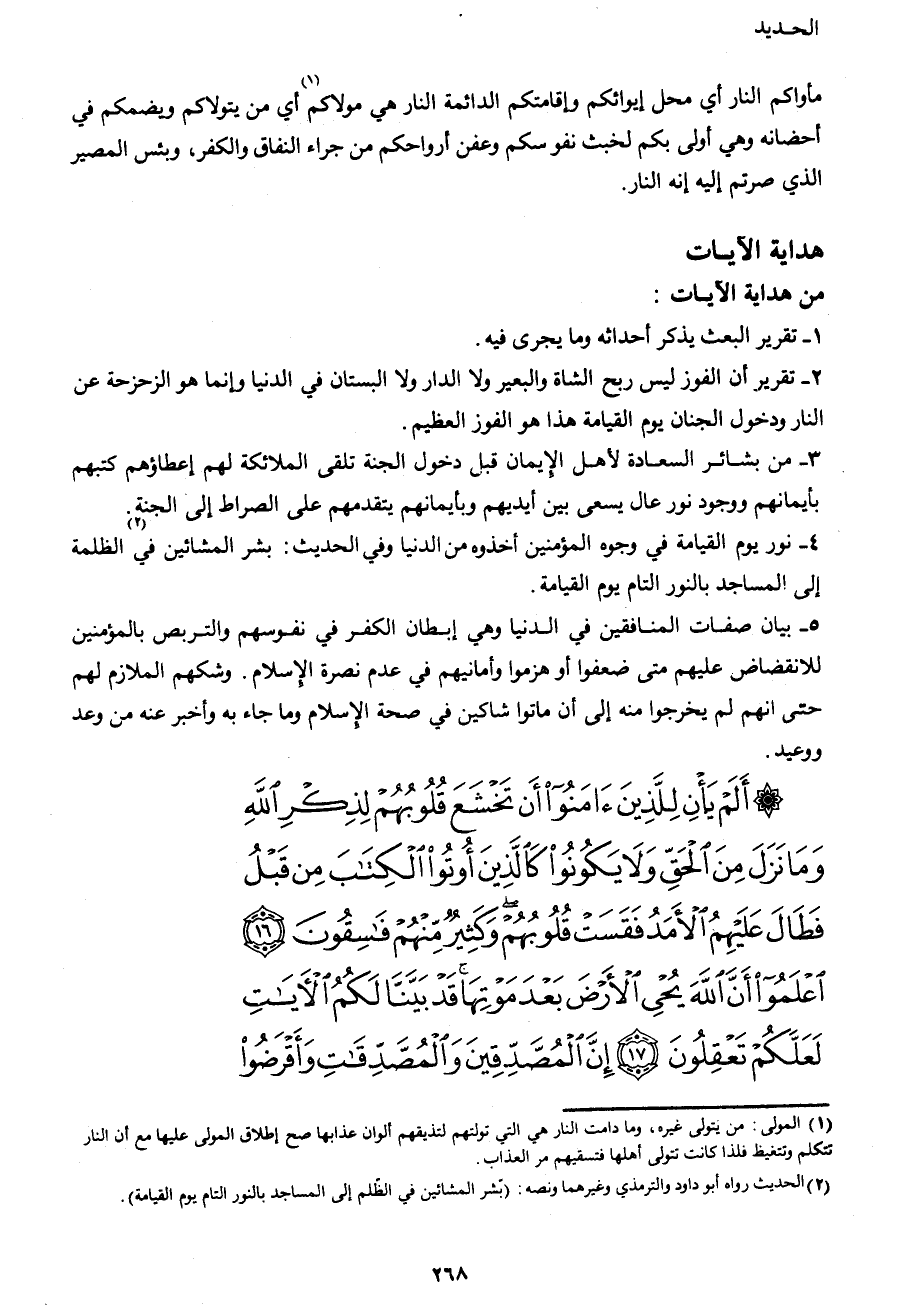أَلَمْ يَأْنِ لِلَّذِينَ آمَنُوا أَنْ تَخْشَعَ قُلُوبُهُمْ لِذِكْرِ اللهِ وَمَا نَزَلَ مِنَ الْحَقِّ وَلا يَكُونُوا كَالَّذِينَ أُوتُوا الْكِتَابَ مِنْ قَبْلُ فَطَالَ عَلَيْهِمُ الْأَمَدُ فَقَسَتْ قُلُوبُهُمْ وَكَثِيرٌ مِنْهُمْ فَاسِقُونَ (16) اعْلَمُوا أَنَّ اللهَ يُحْيِي الْأَرْضَ بَعْدَ مَوْتِهَا قَدْ بَيَّنَّا لَكُمُ الْآياتِ لَعَلَّكُمْ تَعْقِلُونَ (17) إِنَّ الْمُصَّدِّقِينَ وَالْمُصَّدِّقَاتِ وَأَقْرَضُوا