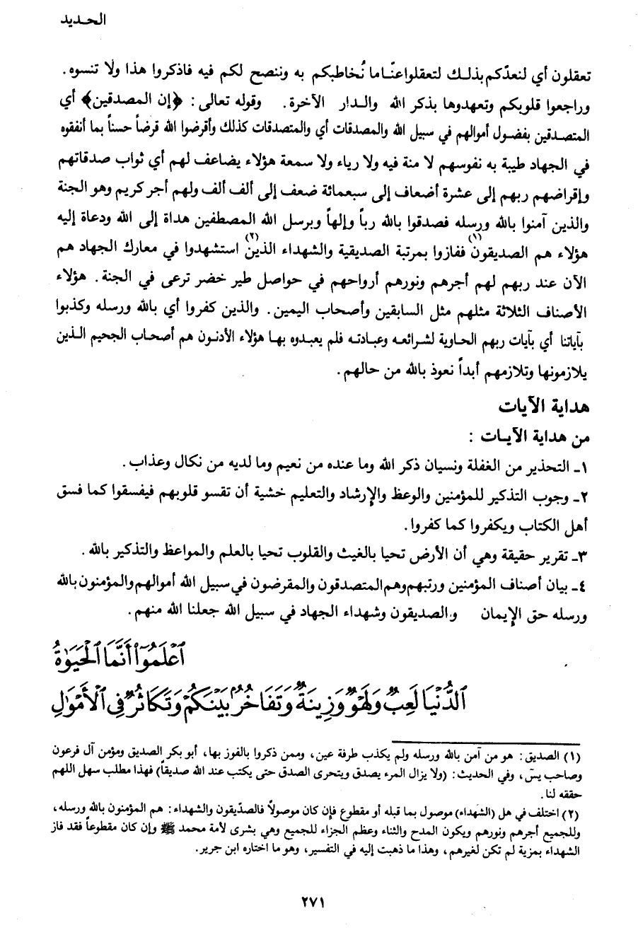 4- بيان أصناف المؤمنين ورتبهم وهم المتصدقون والمقرضون في سبيل الله أموالهم والمؤمنون بالله ورسله حق الإيمان والصديقون وشهداء الجهاد في سبيل الله جعلنا الله منهم.