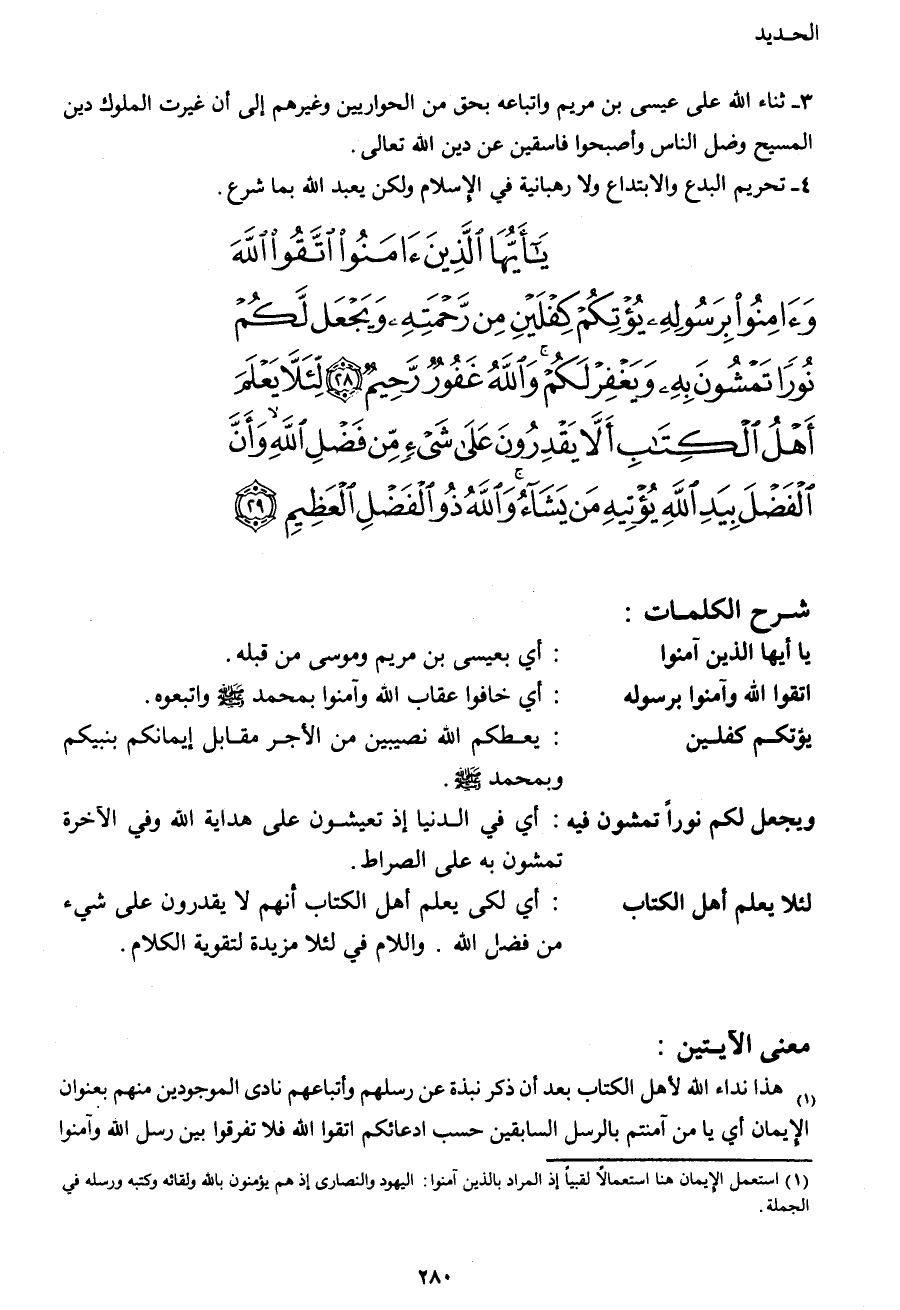 يَا أَيُّهَا الَّذِينَ آمَنُوا اتَّقُوا اللهَ وَآمِنُوا بِرَسُولِهِ يُؤْتِكُمْ كِفْلَيْنِ مِنْ رَحْمَتِهِ وَيَجْعَلْ لَكُمْ نُوراً تَمْشُونَ بِهِ وَيَغْفِرْ لَكُمْ وَاللهُ غَفُورٌ رَحِيمٌ (28) لِئَلَّا يَعْلَمَ أَهْلُ الْكِتَابِ أَلَّا يَقْدِرُونَ عَلَى شَيْءٍ مِنْ فَضْلِ اللهِ وَأَنَّ الْفَضْلَ بِيَدِ اللهِ يُؤْتِيهِ مَنْ يَشَاءُ وَاللهُ ذُو الْفَضْلِ الْعَظِيمِ (29)