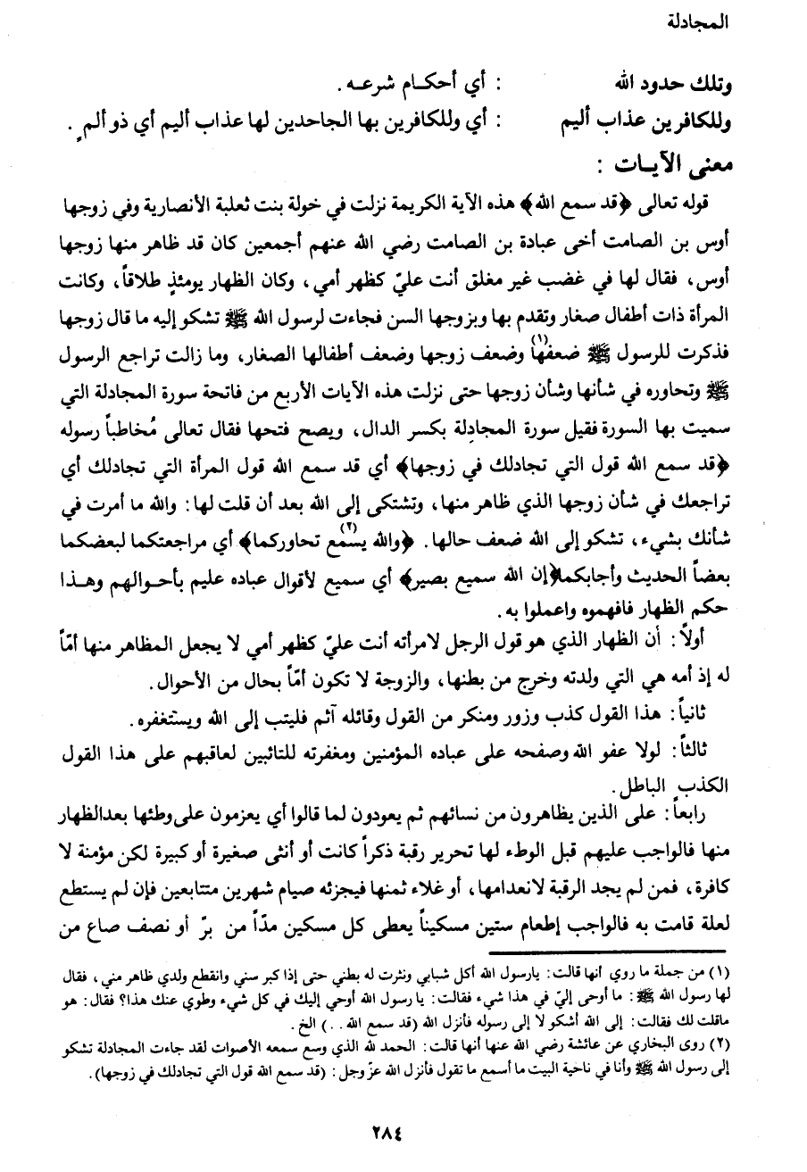 قوله تعالى {قَدْ سَمِعَ اللهُ} هذه الآية الكريمة نزلت في خولة بنت ثعلبة الأنصارية وفي زوجها أوس بن الصامت أخي عبادة بن الصامت رضي الله عنهم أجمعين كان قد ظاهر منها زوجها أوس، فقال لها في غضب غير مغلق أنت علي كظهر أمي، وكان الظهار يومئذٍ طلاقاً، وكانت المرأة ذات أطفال صغار وتقدم بها وبزوجها السن فجاءت لرسول الله صَلَّى اللهُ عَلَيْهِ وَسَلَّمَ تشكوا إليه ما قال زوجها فذكرت للرسول صَلَّى اللهُ عَلَيْهِ وَسَلَّمَ ضعفها1 وضعف زوجها وضعف أطفالها الصغار، وما زالت تراجع الرسول صَلَّى اللهُ عَلَيْهِ وَسَلَّمَ وتحاوره في شأنها وشأن زوجها حتى نزلت هذه الآيات الأربع من فاتحة سورة المجادلة التي سميت بها السورة فقيل سورة المجادلة بكسر الدال، ويصح فتحها فقال تعالى مخاطباً رسوله {قَدْ سَمِعَ اللهُ قَوْلَ الَّتِي تُجَادِلُكَ فِي زَوْجِهَا} أي قد سمع الله قول المرأة التي تجادلك أي تراجعك في شأن زوجها الذي ظاهر منها، وتشتكي إلى الله بعد أن قلت لها: والله ما أمرت في شأنك بشيء، تشكو إلى الله ضعف حالها. {وَاللهُ يَسْمَعُ2 تَحَاوُرَكُمَا} أي مراجعتكما لبعضكما بعضاً الحديث وأجابكما {إِنَّ اللهَ سَمِيعٌ بَصِيرٌ} أي سميع لأقوال عباده عليم بأحوالهم وهذا حكم الظهار فافهموه واعملوا به.