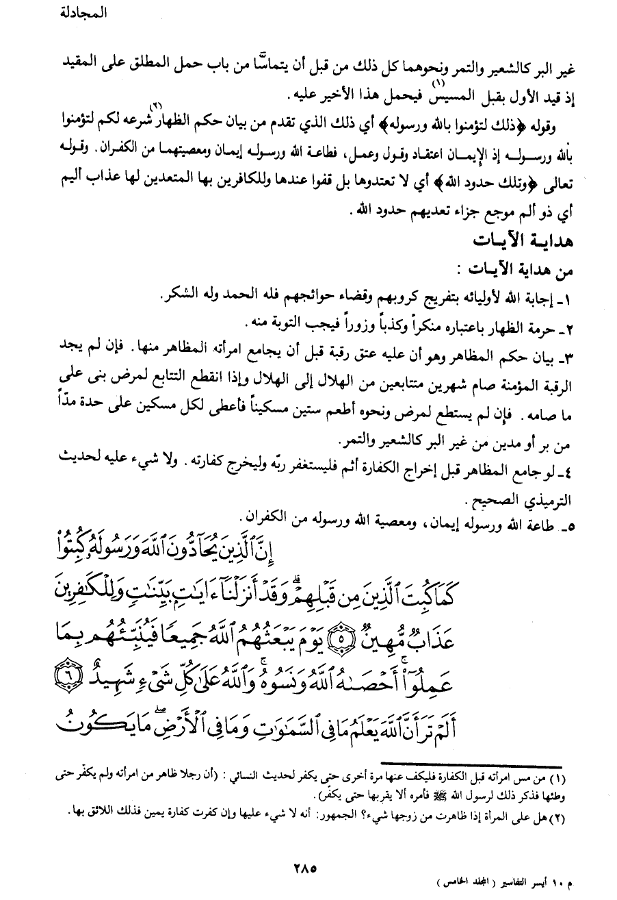 3- بيان حكم المظاهر وهو أن عليه عتق رقبة قبل أن يجامع امرأته المظاهر منها. فإن لم يجد الرقبة المؤمنة صام شهرين متتابعين من الهلال إلى الهلال وإذا انقطع التتابع لمرض بنى على ما صامه. فإن لم يستطع لمرض ونحوه أطعم ستين مسكيناً فأعطى لكل مسكين على حدة مداً من بر أو مدين من غير البر كالشعير والتمر.