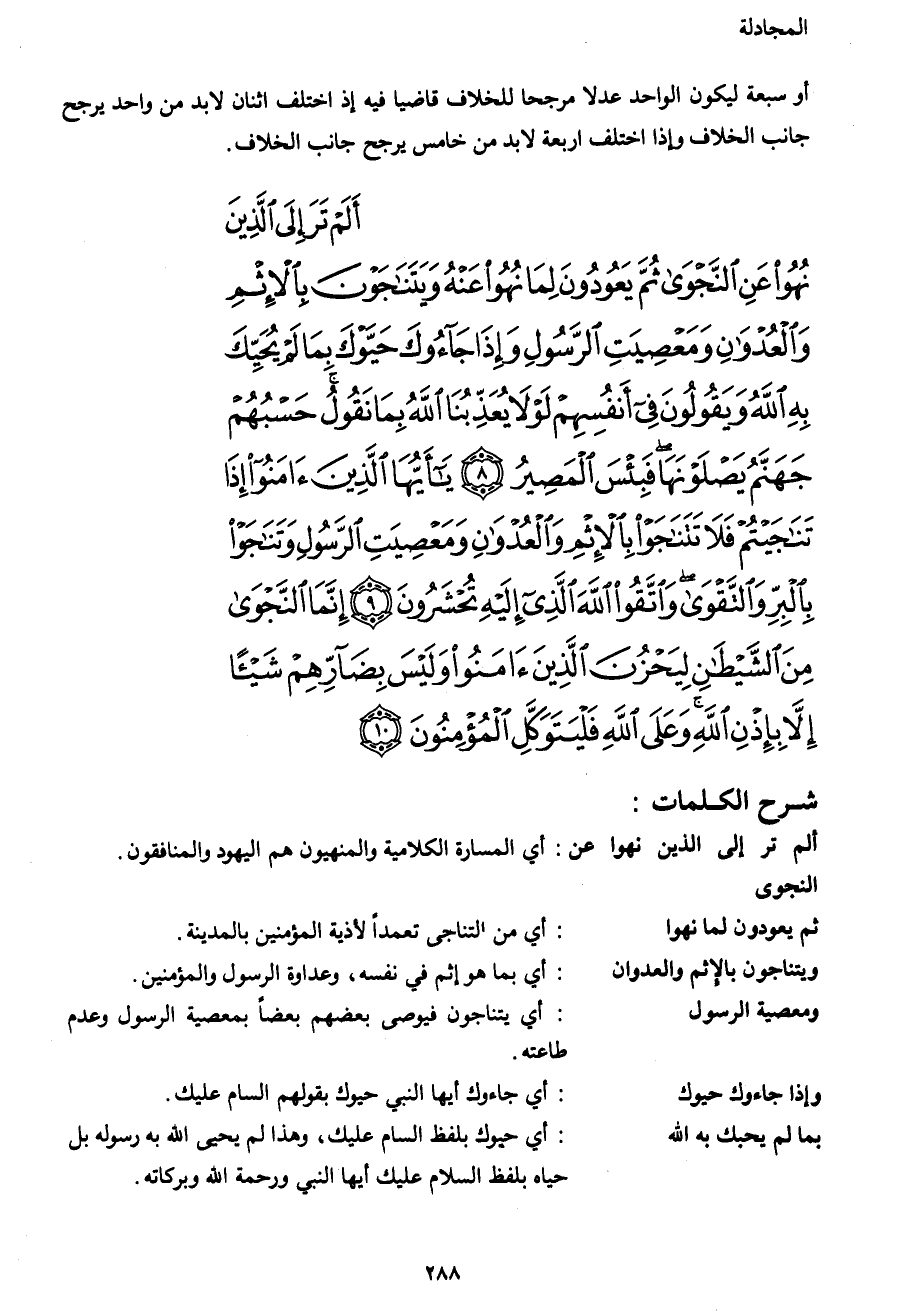 يَا أَيُّهَا الَّذِينَ آمَنُوا إِذَا تَنَاجَيْتُمْ فَلا تَتَنَاجَوْا بِالْأِثْمِ وَالْعُدْوَانِ وَمَعْصِيَتِ الرَّسُولِ وَتَنَاجَوْا بِالْبِرِّ وَالتَّقْوَى وَاتَّقُوا اللهَ الَّذِي إِلَيْهِ تُحْشَرُونَ (9) إِنَّمَا النَّجْوَى مِنَ الشَّيْطَانِ لِيَحْزُنَ الَّذِينَ آمَنُوا وَلَيْسَ بِضَارِّهِمْ شَيْئاً إِلَّا بِإِذْنِ اللهِ وَعَلَى اللهِ فَلْيَتَوَكَّلِ الْمُؤْمِنُونَ (10)
