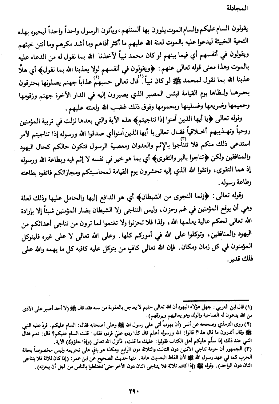 وقوله تعالى {إِنَّمَا النَّجْوَى مِنَ الشَّيْطَانِ} أي هو الدافع إليها والحامل عليها وذلك لعلة وهي أن يوقع المؤمنين في غم وحزن, وليس التناجي ولا الشيطان بضار المؤمنين شيئاً إلا بإرادة الله تعالى لحكم عالية يعلمها الله, ولذا فلا تحزنوا ولا تغتموا لما ترون من تناجي أعدائكم من اليهود والمنافقين, وتوكلوا على الله في أموركم كلها. وعلى الله تعالى لا على غيره فليتوكل المؤمنون في كل زمان ومكان. فإن الله تعالى كاف من يتوكل عليه كافيه كل ما يهمه والله على ذلك قدير.
