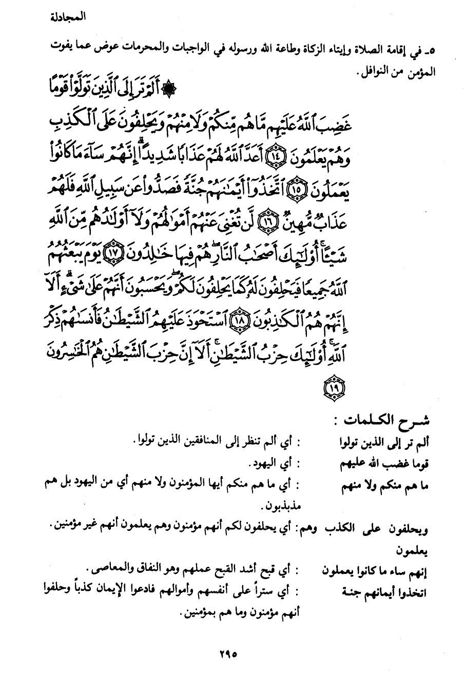 أَلَمْ تَرَ إِلَى الَّذِينَ تَوَلَّوْا قَوْماً غَضِبَ اللهُ عَلَيْهِمْ مَا هُمْ مِنْكُمْ وَلا مِنْهُمْ وَيَحْلِفُونَ عَلَى الْكَذِبِ وَهُمْ يَعْلَمُونَ (14) أَعَدَّ اللهُ لَهُمْ عَذَاباً شَدِيداً إِنَّهُمْ سَاءَ مَا كَانُوا يَعْمَلُونَ (15) اتَّخَذُوا أَيْمَانَهُمْ جُنَّةً فَصَدُّوا عَنْ سَبِيلِ اللهِ فَلَهُمْ عَذَابٌ مُهِينٌ (16) لَنْ تُغْنِيَ عَنْهُمْ أَمْوَالُهُمْ وَلا أَوْلادُهُمْ مِنَ اللهِ شَيْئاً أُولَئِكَ أَصْحَابُ النَّارِ هُمْ فِيهَا خَالِدُونَ (17) يَوْمَ يَبْعَثُهُمُ اللهُ جَمِيعاً فَيَحْلِفُونَ لَهُ كَمَا يَحْلِفُونَ لَكُمْ وَيَحْسَبُونَ أَنَّهُمْ عَلَى شَيْءٍ أَلا إِنَّهُمْ هُمُ الْكَاذِبُونَ (18) اسْتَحْوَذَ عَلَيْهِمُ الشَّيْطَانُ فَأَنْسَاهُمْ ذِكْرَ اللهِ أُولَئِكَ حِزْبُ الشَّيْطَانِ أَلا إِنَّ حِزْبَ الشَّيْطَانِ هُمُ الْخَاسِرُونَ (19)