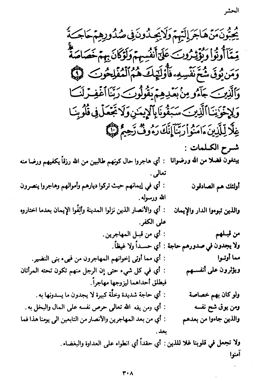 يُحِبُّونَ مَنْ هَاجَرَ إِلَيْهِمْ وَلا يَجِدُونَ فِي صُدُورِهِمْ حَاجَةً مِمَّا أُوتُوا وَيُؤْثِرُونَ عَلَى أَنْفُسِهِمْ وَلَوْ كَانَ بِهِمْ خَصَاصَةٌ وَمَنْ يُوقَ شُحَّ نَفْسِهِ فَأُولَئِكَ هُمُ الْمُفْلِحُونَ (9) وَالَّذِينَ جَاءُوا مِنْ بَعْدِهِمْ يَقُولُونَ رَبَّنَا اغْفِرْ لَنَا وَلِإِخْوَانِنَا الَّذِينَ سَبَقُونَا بِالْأِيمَانِ وَلا تَجْعَلْ فِي قُلُوبِنَا غِلّاً لِلَّذِينَ آمَنُوا رَبَّنَا إِنَّكَ رَؤُوفٌ رَحِيمٌ (10)