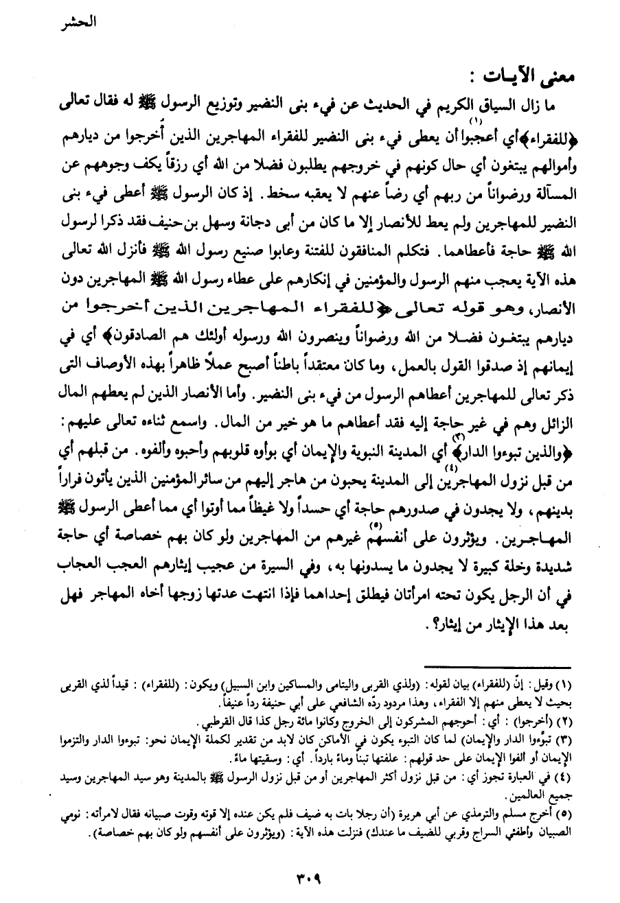ما زال السياق الكريم في الحديث عن فيء بني النضير وتوزيع الرسول صَلَّى اللهُ عَلَيْهِ وَسَلَّمَ له فقال تعالى {لِلْفُقَرَاءِ} أي أعجبوا1 أن يعطى فيء بني النضير للفقراء المهاجرين الذين أخرجوا من ديارهم وأموالهم يبتغون أي حال كونهم في خروجهم يطلبون فضلا من الله أي رزقاً يكف وجوههم عن المسألة ورضواناً من ربهم أي رضاً عنهم لا يعقبه سخط. إذ كان الرسول صَلَّى اللهُ عَلَيْهِ وَسَلَّمَ أعطى فيء بني النضير للمهاجرين ولم يعط للأنصار إلا ما كان من أبي دجانة وسهل بن حنيف فقد ذكروا لرسوله الله صَلَّى اللهُ عَلَيْهِ وَسَلَّمَ حاجة فأعطاهما. فتكلم المنافقون للفتنة وعابوا صنيع رسول الله صَلَّى اللهُ عَلَيْهِ وَسَلَّمَ فأنزل الله تعالى هذه الآية يعجب منهم الرسول والمؤمنون في إنكارهم على عطاء رسول الله صَلَّى اللهُ عَلَيْهِ وَسَلَّمَ المهاجرين دون الأنصار، وهو قوله تعالى {لِلْفُقَرَاءِ الْمُهَاجِرِينَ الَّذِينَ أُخْرِجُوا2 مِنْ دِيَارِهِمْ وَأَمْوَالِهِمْ يَبْتَغُونَ فَضْلاً مِنَ اللهِ وَرِضْوَاناً وَيَنْصُرُونَ اللهَ وَرَسُولَهُ أُولَئِكَ هُمُ الصَّادِقُونَ} أي في إيمانهم إذ صدقوا القول بالعمل، وما كان معتقداً باطناً أصبح عملاً ظاهراً بهذه الأوصاف التي ذكر تعالى للمهاجرين أعطاهم الرسول من فيء بني النضير. وأما الأنصار الذين لم يعطهم المال الزائل وهم في غير حاجة إليه فقد أعطاهم ما هو خير من المال. واسمع ثناؤه تعالى عليهم: {وَالَّذِينَ تَبَوَّأُوا الدَّارَ} 3 أي المدينة النبوية والإيمان أي بوأوه قلوبهم وأحبوه وألفوه. من قبلهم أي من قبل نزول المهاجرين4 إلى المدينة يحبون من هاجر إليهم من سائر المؤمنين الذين يأتون فراراً بدينهم، ولا يجدون في صدورهم حاجة أي حسداً ولا غيظاً مما أوتوا أي مما أعطوا الرسول صَلَّى اللهُ عَلَيْهِ وَسَلَّمَ المهاجرين. ويؤثرون على أنفسهم5 غيرهم من المهاجرين ولو كان بهم خصاصة أي حاجة شديدة وخلة كبيرة لا يجدون ما يسدونها به، وفي السيرة من عجيب إيثارهم العجب العجاب في أن الرجل يكون تحته امرأتان فيطلق إحداهما فإذا انتهت عدتها زوجها أخاه المهاجر فهل بعد هذا الإيثار من إيثار؟.
