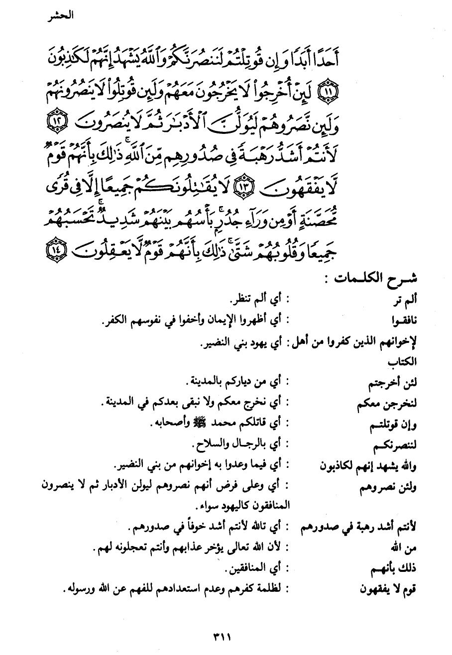 أَحَداً أَبَداً وَإِنْ قُوتِلْتُمْ لَنَنْصُرَنَّكُمْ وَاللهُ يَشْهَدُ إِنَّهُمْ لَكَاذِبُونَ (11) لَئِنْ أُخْرِجُوا لا يَخْرُجُونَ مَعَهُمْ وَلَئِنْ قُوتِلُوا لا يَنْصُرُونَهُمْ وَلَئِنْ نَصَرُوهُمْ لَيُوَلُّنَّ الْأَدْبَارَ ثُمَّ لا يُنْصَرُونَ (12) لَأَنْتُمْ أَشَدُّ رَهْبَةً فِي صُدُورِهِمْ مِنَ اللهِ ذَلِكَ بِأَنَّهُمْ قَوْمٌ لا يَفْقَهُونَ (13) لا يُقَاتِلُونَكُمْ جَمِيعاً إِلَّا فِي قُرىً مُحَصَّنَةٍ أَوْ مِنْ وَرَاءِ جُدُرٍ بَأْسُهُمْ بَيْنَهُمْ شَدِيدٌ تَحْسَبُهُمْ جَمِيعاً وَقُلُوبُهُمْ شَتَّى ذَلِكَ بِأَنَّهُمْ قَوْمٌ لا يَعْقِلُونَ (14)