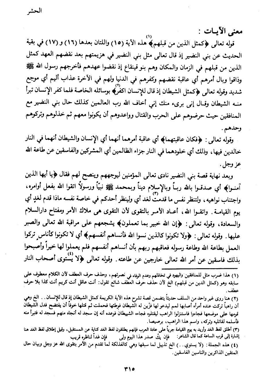 قوله تعالى {كَمَثَلِ الَّذِينَ مِنْ قَبْلِهِمْ} 1 هذه الآية (15) واللتان بعدها (16) و (17) في بقية الحديث عن بني النضير إذ قال تعالى مثل بنو النضير في هزيمتهم بعد نقضهم العهد كمثل الذين من قبلهم في الزمان والمكان وهم بنو قينقاع إذ نقضوا عهدهم فأخرجهم رسول الله صَلَّى اللهُ عَلَيْهِ وَسَلَّمَ وذاقوا وبال أمرهم أي عاقبة نقضهم وكفرهم في الدنيا ولهم في الآخرة عذاب أليم أي موجع شديد وقوله تعالى {كَمَثَلِ الشَّيْطَانِ إِذْ قَالَ لِلْإِنْسَانِ اكْفُرْ2} بوسائله الخاصة فلما كفر الإنسان تبرأ منه الشيطان وقال إني بريء منك إني أخاف الله رب العالمين كذلك حال بني النضير مع المنافقين حيث حرضوهم على الحرب والقتال وواعدوهم أن يكونوا معهم ثم خذلوهم وتركوهم حدهم.