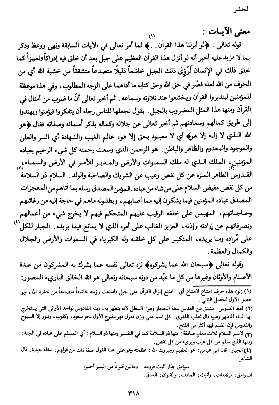 قوله تعالى {لَوْ أَنْزَلْنَا هَذَا الْقُرْآنَ..1} لما أمر تعالى في الآيات السابقة ونهى ووعظ وذكر بما لا مزيد عليه أخبر أنه لو أنزل هذا القرآن العظيم على جبل بعد أن خلق فيه إدراكاً وتمييزاً كما خلق ذلك في الإنسان لرؤى ذلك الجبل خاشعاً ذليلاً متصدعاً متشققاً من خشية الله أي من الخوف من الله لعله قصر في حق الله وحق كتابه ما أداهما على الوجه المطلوب, وفي هذا موعظة للمؤمنين ليتدبروا القرآن ويخشعوا عند تلاوته وسماعه. ثم أخبر تعالى أن ما ضرب من أمثال في القرآن ومنها هذا المثل المضروب بالجبل. يقول نجعلها للناس رجاء أن يتفكروا فيؤمنوا ويهتدوا إلى طريق كمالهم وسعادتهم ثم أخبر تعالى عن جلاله وكماله بذكر أسمائه وصفاته فقال {هُوَ اللهُ الَّذِي لا إِلَهَ إِلَّا هُوَ} أي لا معبود بحق إلا هو, عالم الغيب والشهادة أي السر والعلن والموجود والمعدوم والظاهر والباطن. هو الرحمن الذي وسعت رحمته كل شيء الرحيم بعباده المؤمنين, الملك الذي له ملك السموات والأرض والمدبر للأمر في الأرض والسماء, القدوس2 الطاهر المنزه عن كل نقص وعيب عن الشريك والصاحبة والولد. السلام ذو السلامة3 من كل نقص مفيض السلام على من شاء من عباده. المؤمن المصدق رسله بما آتاهم من المعجزات المصدق عباده المؤمنين فيما يشكون إليه مما أصابهم, ويطلبونه ما هم في حاجة إليه من رغائبهم وحاجاتهم, المهيمن على خلقه الرقيب عليهم المتحكم فيهم لا يخرج شيء من أعمالهم وتصرفاتهم عن إرادته وإذنه, العزيز الغالب على أمره الذي لا يمانع فيما يريده. الجبار للكل4