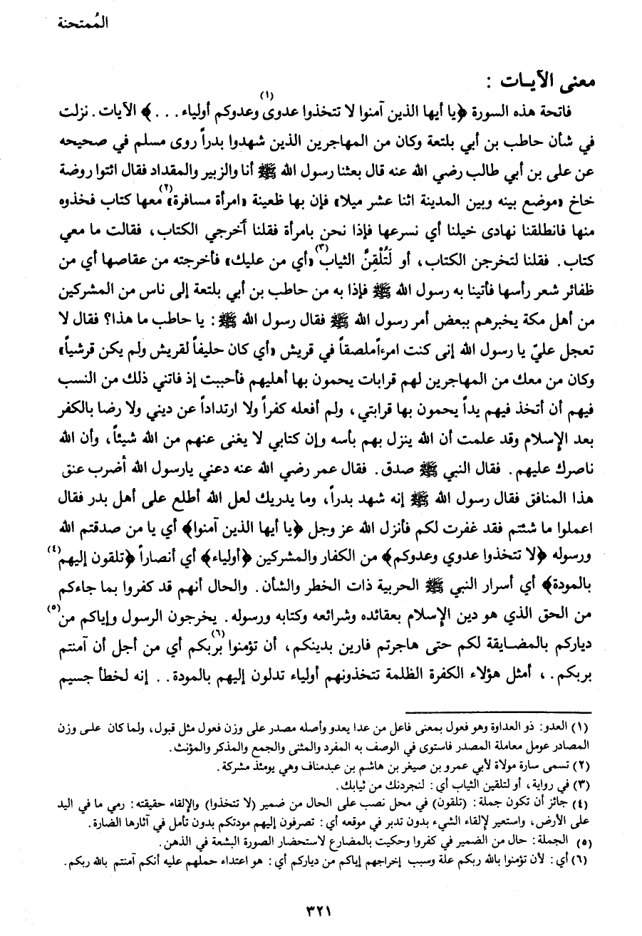فاتحة هذه السورة {يَا أَيُّهَا الَّذِينَ آمَنُوا لا تَتَّخِذُوا عَدُوِّي1 وَعَدُوَّكُمْ أَوْلِيَاءَ ... } الآيات. نزلت في شأن حاطب بن أبي بلتعة وكان من المهاجرين الذين شهدوا بدراً روى مسلم في صحيحه عن علي بن أبي طالب رضي الله عنه قال بعثنا رسول الله صَلَّى اللهُ عَلَيْهِ وَسَلَّمَ أنا والزبير والمقداد فقال ائتوا روضة خاخ (موضع بينه وبين المدينة اثنا عشر ميلا) فإن بها ظعينة (امرأة مسافرة) 2 معها كتاب فخذوه منها فانطلقنا نهادى خيلنا أي نسرعها فإذا نحن بامرأة فقلنا أخرجي الكتاب، فقالت ما معي كتاب. فقلنا لتخرجن الكتاب، أو لتلقن الثياب3 (أي من عليك) فأخرجته من عقاصها أي من ظفائر شعر رأسها فأتينا به رسول الله صَلَّى اللهُ عَلَيْهِ وَسَلَّمَ فإذا به من حاطب بن أبي بلتعة إلى ناس من المشركين من أهل مكة يخبرهم ببعض أمر رسول الله صَلَّى اللهُ عَلَيْهِ وَسَلَّمَ فقال رسول الله صَلَّى اللهُ عَلَيْهِ وَسَلَّمَ: يا حاطب ما هذا؟ فقال لا تعجل علي يا رسول الله إني كنت امرءاً ملصقاً في قريش (أي كان حليفاً لقريش ولم يكن قرشياً) وكان من معك من المهاجرين لهم قرابات يحمون بها أهليهم فأحببت إذ فاتني ذلك من النسب فيهم أن أتخذ فيهم يداً يحمون بها قرابتي، ولم أفعله كفراً ولا ارتداداً عن ديني ولا رضا بالكفر بعد الإسلام وقد علمت أن الله ينزل بهم بأسه وأن كتابي لا يغني عنهم من الله شيئاً، وأن الله ناصرك عليهم. فقال النبي صَلَّى اللهُ عَلَيْهِ وَسَلَّمَ صدق. فقال عمر رضي الله عنه دعني يا رسول الله أضرب عنق هذا المنافق فقال رسول الله صَلَّى اللهُ عَلَيْهِ وَسَلَّمَ إنه شهد بدراً، وما يدريك لعل الله أطلع على أهل بدر فقال اعملوا ما شئتم فقد غفرت لكم فأنزل الله عز وجل {يَا أَيُّهَا الَّذِينَ آمَنُوا} أي يا من صدقتم الله ورسوله {لا تَتَّخِذُوا عَدُوِّي وَعَدُوَّكُمْ} من الكفار والمشركين {أَوْلِيَاءَ} أي أنصاراً {تُلْقُونَ إِلَيْهِمْ4 بِالْمَوَدَّةِ} أي أسرار النبي صَلَّى اللهُ عَلَيْهِ وَسَلَّمَ الحربية ذات الخطر والشأن. والحال أنهم قد كفروا بما جاءكم من الحق الذي هو دين الإسلام بعقائده وشرائعه وكتابه ورسوله. يخرجون الرسول وإياكم من5 دياركم بالمضايقة لكم حتى هاجرتم فارين بدينكم، أن تؤمنوا6 بربكم أي من أجل أن آمنتم بربكم.، أمثل هؤلاء الكفرة الظلمة تتخذونهم أولياء تدلون إليهم بالمودة ... إنه لخطأ جسيم