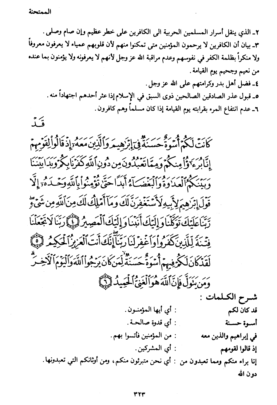 قَدْ كَانَتْ لَكُمْ أُسْوَةٌ حَسَنَةٌ فِي إِبْرَاهِيمَ وَالَّذِينَ مَعَهُ إِذْ قَالُوا لِقَوْمِهِمْ إِنَّا بُرَآءُ مِنْكُمْ وَمِمَّا تَعْبُدُونَ مِنْ دُونِ اللهِ كَفَرْنَا بِكُمْ وَبَدَا بَيْنَنَا وَبَيْنَكُمُ الْعَدَاوَةُ وَالْبَغْضَاءُ أَبَداً حَتَّى تُؤْمِنُوا بِاللهِ وَحْدَهُ إِلَّا قَوْلَ إِبْرَاهِيمَ لِأَبِيهِ لَأَسْتَغْفِرَنَّ لَكَ وَمَا أَمْلِكُ لَكَ مِنَ اللهِ مِنْ شَيْءٍ رَبَّنَا عَلَيْكَ تَوَكَّلْنَا وَإِلَيْكَ أَنَبْنَا وَإِلَيْكَ الْمَصِيرُ (4) رَبَّنَا لا تَجْعَلْنَا فِتْنَةً لِلَّذِينَ كَفَرُوا وَاغْفِرْ لَنَا رَبَّنَا إِنَّكَ أَنْتَ الْعَزِيزُ الْحَكِيمُ (5) لَقَدْ كَانَ لَكُمْ فِيهِمْ أُسْوَةٌ حَسَنَةٌ لِمَنْ كَانَ يَرْجُو اللهَ وَالْيَوْمَ الْآخِرَ وَمَنْ يَتَوَلَّ فَإِنَّ اللهَ هُوَ الْغَنِيُّ الْحَمِيدُ (6)