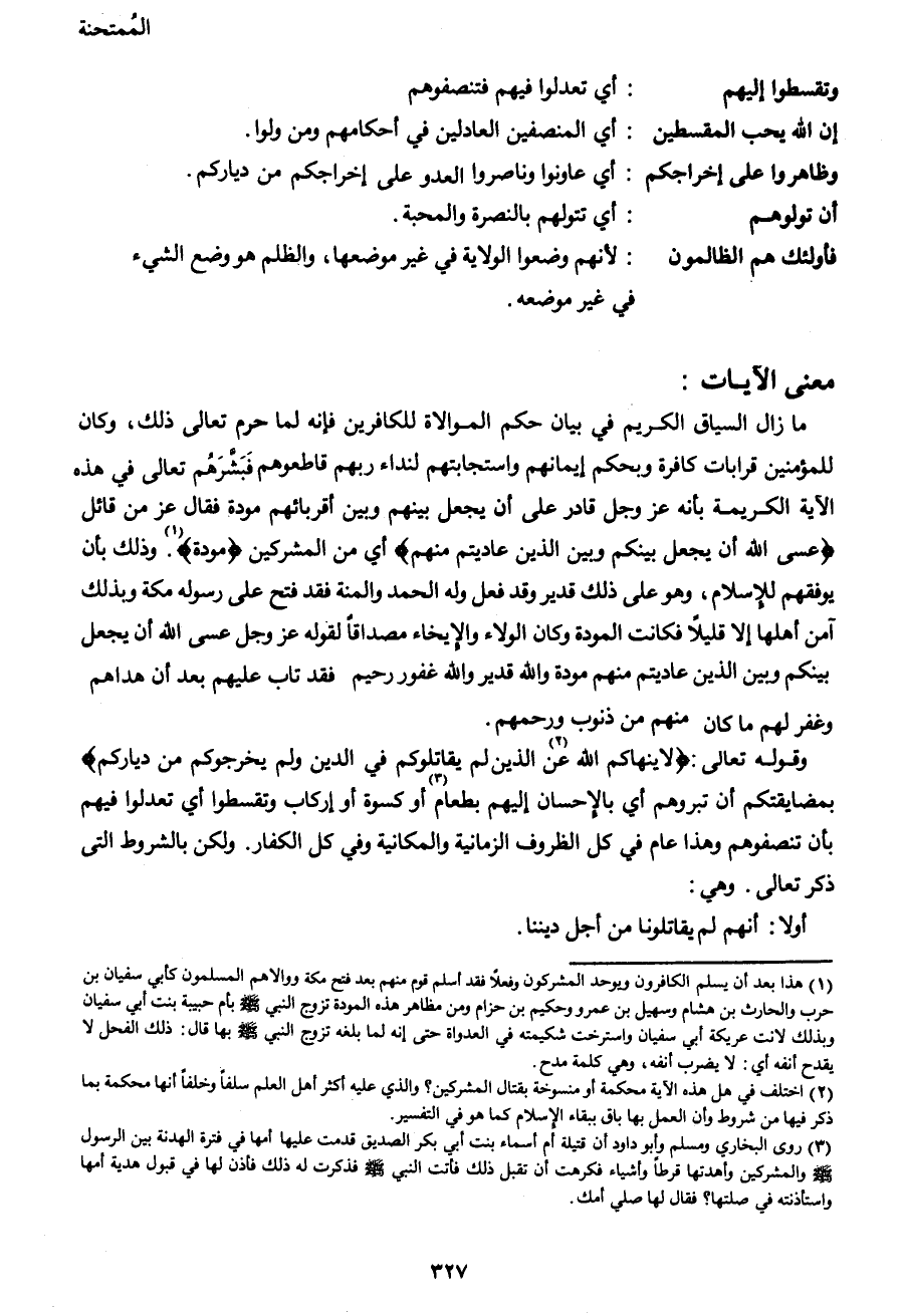 1 هذا بعد أن يسلم الكافرون ويوحد المشركون وفعلاً فقد أسلم قوم منهم بعد فتح مكة ووالاهم المسلمون كأبي سفيان بن حرب والحارث بن هشام وسهيل بن عمرو وحكيم بن حزام ومن مظاهر هذه المودة تزوج النبي صَلَّى اللهُ عَلَيْهِ وَسَلَّمَ بأم حبيبة بنت أبي سفيان وبذلك لانت عريكة أبي سفيان واسترخت شكيمته في العداوة حتى إنه لما بلغه تزوج النبي صَلَّى اللهُ عَلَيْهِ وَسَلَّمَ بها قال: ذلك الفحل لا يقدح أنفه أي: لا يضرب أنفه، وهي كلمة مدح.