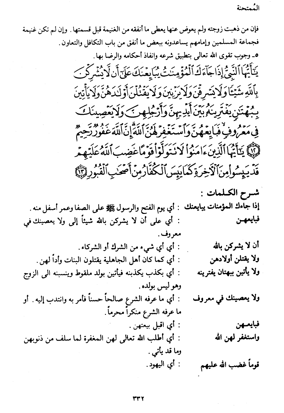يَا أَيُّهَا النَّبِيُّ إِذَا جَاءَكَ الْمُؤْمِنَاتُ يُبَايِعْنَكَ عَلَى أَنْ لا يُشْرِكْنَ بِاللهِ شَيْئاً وَلا يَسْرِقْنَ وَلا يَزْنِينَ وَلا يَقْتُلْنَ أَوْلادَهُنَّ وَلا يَأْتِينَ بِبُهْتَانٍ يَفْتَرِينَهُ بَيْنَ أَيْدِيهِنَّ وَأَرُجُلِهِنَّ وَلا يَعْصِينَكَ فِي مَعْرُوفٍ فَبَايِعْهُنَّ وَاسْتَغْفِرْ لَهُنَّ اللهَ إِنَّ اللهَ غَفُورٌرَحِيمٌ (12)