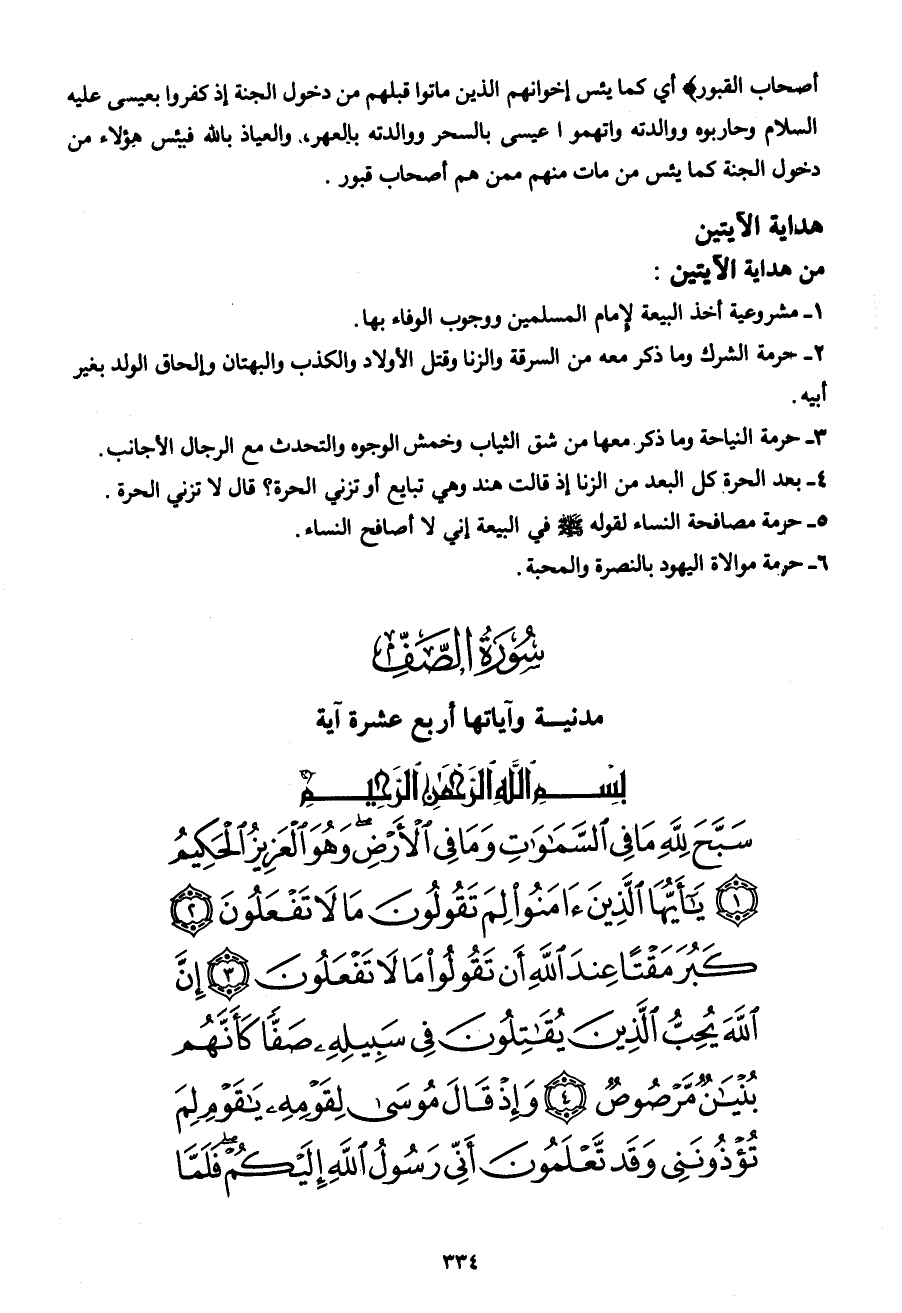 سَبَّحَ لِلَّهِ مَا فِي السَّمَاوَاتِ وَمَا فِي الْأَرْضِ وَهُوَ الْعَزِيزُ الْحَكِيمُ (1) يَا أَيُّهَا الَّذِينَ آمَنُوا لِمَ تَقُولُونَ مَا لا تَفْعَلُونَ (2) كَبُرَ مَقْتاً عِنْدَ اللهِ أَنْ تَقُولُوا مَا لا تَفْعَلُونَ (3) إِنَّ اللهَ يُحِبُّ الَّذِينَ يُقَاتِلُونَ فِي سَبِيلِهِ صَفّاً كَأَنَّهُمْ بُنْيَانٌ مَرْصُوصٌ (4) وَإِذْ قَالَ مُوسَى لِقَوْمِهِ يَا قَوْمِ لِمَ تُؤْذُونَنِي وَقَدْ تَعْلَمُونَ أَنِّي رَسُولُ اللهِ إِلَيْكُمْ فَلَمَّا