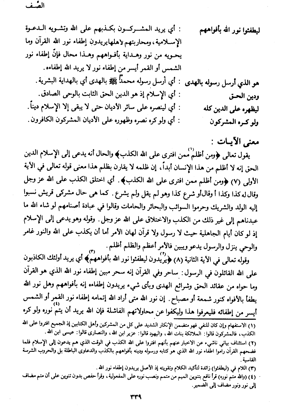 وقوله تعالى في الآية الثانية (8) {يُرِيدُونَ2 لِيُطْفِئُوا نُورَ اللهِ بِأَفْوَاهِهِمْ3} أي يريد أولئك الكاذبون على الله القائلون في الرسول: ساحر وفي القرآن إنه سحر مبين إطفاء نور الله الذي هو القرآن وما حواه من عقائد الحق وشرائع الهدى وبأي شيء يريدون إطفاءه إنه بأفواههم وهل نور الله يطفأ بالأفواه كنور شمعة أو مصباح. إن نور الله متى أراد الله إتمامه إطفاء نور القمر أو الشمس أيسر من إطفائه فليعرفوا هذا وليكفوا عن محاولاتهم الفاشلة فإن الله يريد أن يتم4 نوره ولو كره