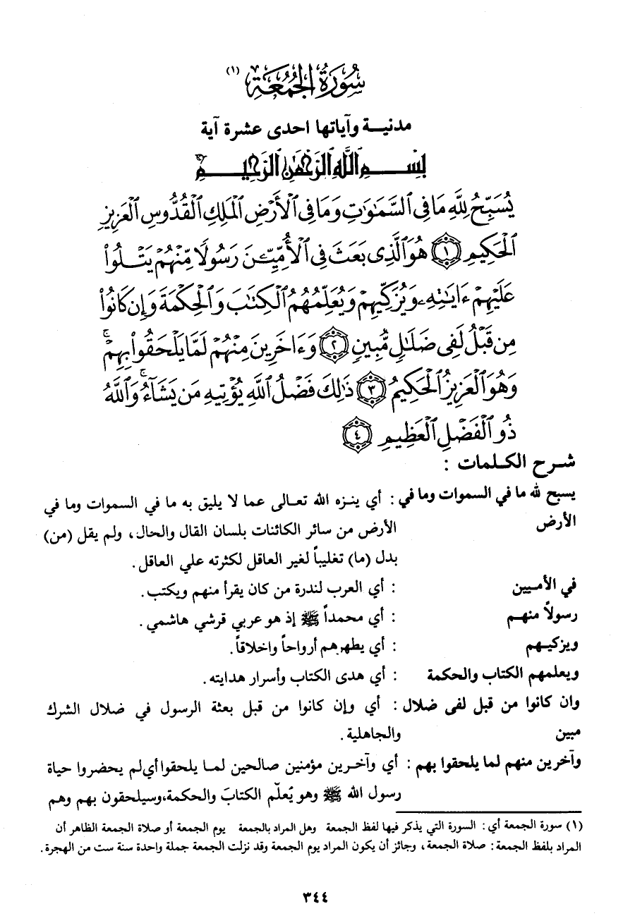 يُسَبِّحُ لِلَّهِ مَا فِي السَّمَاوَاتِ وَمَا فِي الْأَرْضِ الْمَلِكِ الْقُدُّوسِ الْعَزِيزِ الْحَكِيمِ (1) هُوَ الَّذِي بَعَثَ فِي الْأُمِّيِّينَ رَسُولاً مِنْهُمْ يَتْلُو عَلَيْهِمْ آيَاتِهِ وَيُزَكِّيهِمْ وَيُعَلِّمُهُمُ الْكِتَابَ وَالْحِكْمَةَ وَإِنْ كَانُوا مِنْ قَبْلُ لَفِي ضَلالٍ مُبِينٍ (2) وَآخَرِينَ مِنْهُمْ لَمَّا يَلْحَقُوا بِهِمْ وَهُوَ الْعَزِيزُ الْحَكِيمُ (3) ذَلِكَ فَضْلُ اللهِ يُؤْتِيهِ مَنْ يَشَاءُ وَاللهُ ذُو الْفَضْلِ الْعَظِيمِ (4)