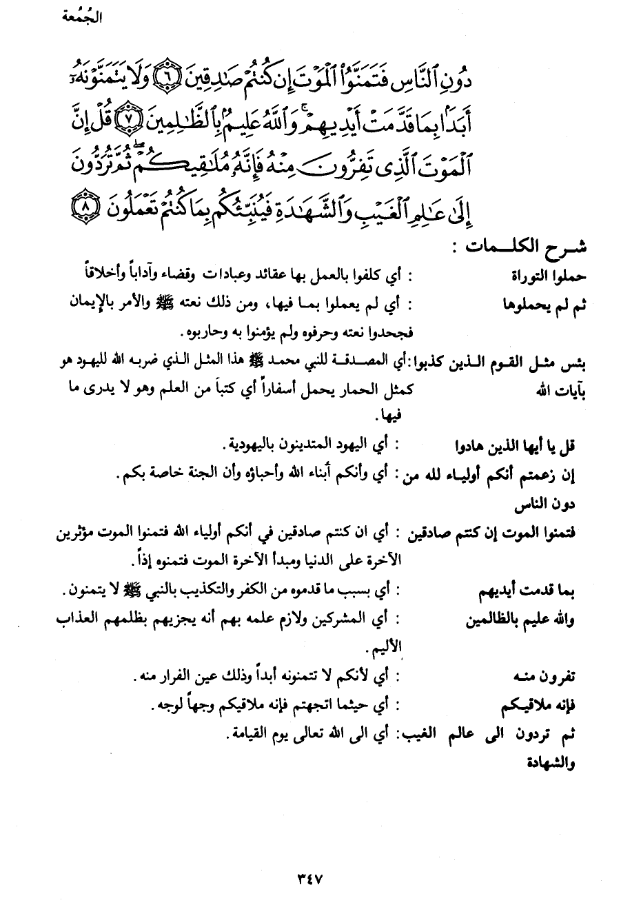 دُونِ النَّاسِ فَتَمَنَّوُا الْمَوْتَ إِنْ كُنْتُمْ صَادِقِينَ (6) وَلا يَتَمَنَّوْنَهُ أَبَداً بِمَا قَدَّمَتْ أَيْدِيهِمْ وَاللهُ عَلِيمٌ بِالظَّالِمِينَ (7) قُلْ إِنَّ الْمَوْتَ الَّذِي تَفِرُّونَ مِنْهُ فَإِنَّهُ مُلاقِيكُمْ ثُمَّ تُرَدُّونَ إِلَى عَالِمِ الْغَيْبِ وَالشَّهَادَةِ فَيُنَبِّئُكُمْ بِمَا كُنْتُمْ تَعْمَلُونَ (8)