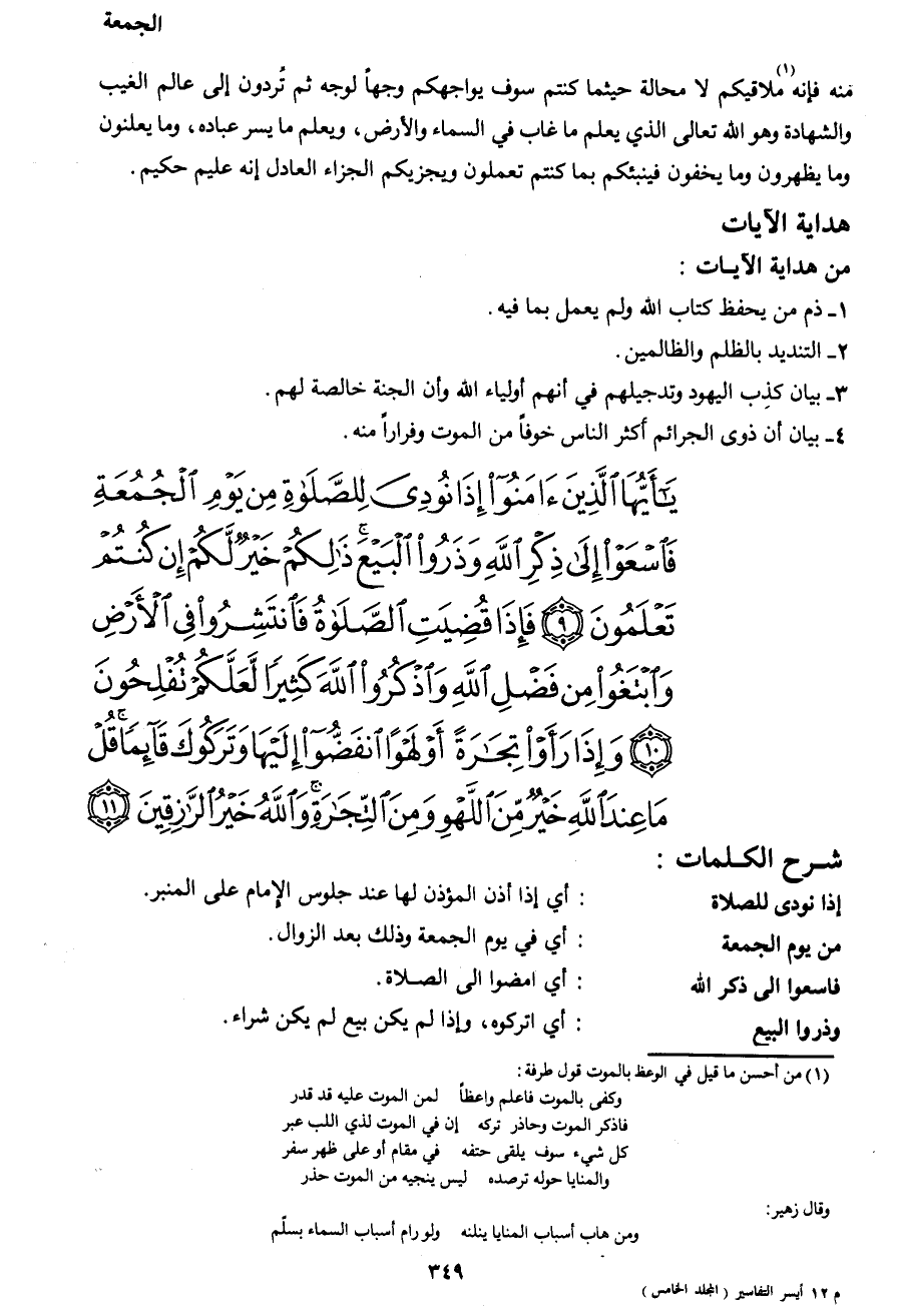 يَا َيُّهَا الَّذِينَ آمَنُوا إِذَا نُودِيَ لِلصَّلاةِ مِنْ يَوْمِ الْجُمُعَةِ فَاسَعَوْا إِلَى ذِكْرِ اللهِ وَذَرُوا الْبَيْعَ ذَلِكُمْ خَيْرٌ لَكُمْ إِنْ كُنْتُمْ تَعْلَمُونَ (9) فَإِذَا قُضِيَتِ الصَّلاةُ فَانْتَشِرُوا فِي الْأَرْضِ وَابْتَغُوا مِنْ فَضْلِ اللهِ وَاذْكُرُوا اللهَ كَثِيراً لَعَلَّكُمْ تُفْلِحُونَ (10) وَإِذَا رَأَوْا تِجَارَةً أَوْ لَهْواً انْفَضُّوا إِلَيْهَا وَتَرَكُوكَ قَائِماً قُلْ مَا عِنْدَ اللهِ خَيْرٌ مِنَ اللهْوِ وَمِنَ التِّجَارَةِ وَاللهُ خَيْرُ الرَّازِقِينَ (11)