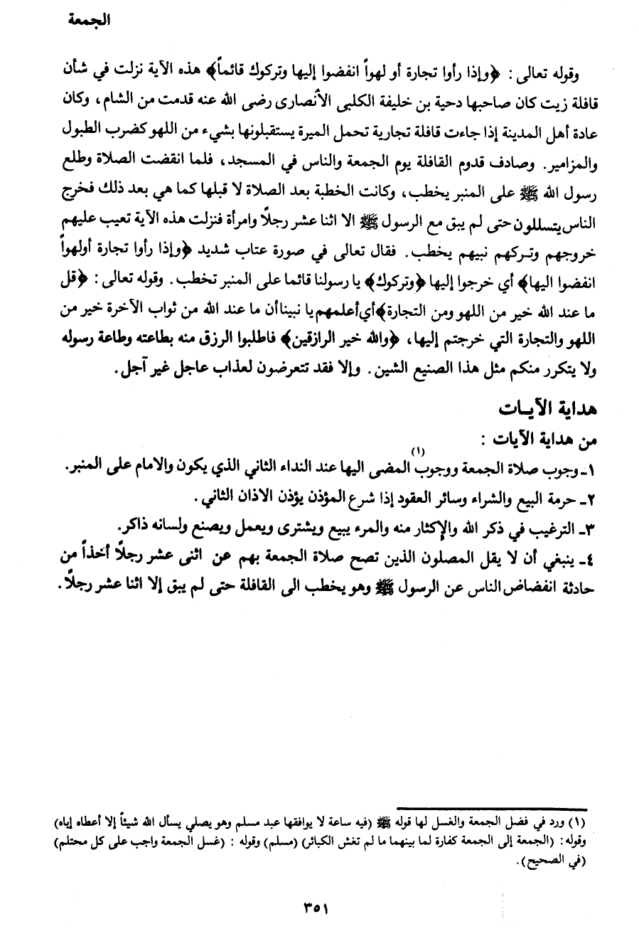 4- ينبغي أن لا يقل المصلون الذين تصح صلاة الجمعة بهم عن اثني عشر رجلاً أخذاً من حادثة انفضاض الناس عن الرسول صَلَّى اللهُ عَلَيْهِ وَسَلَّمَ وهو يخطب إلى القافلة حتى لم يبق إلا اثنا عشر رجلاً.