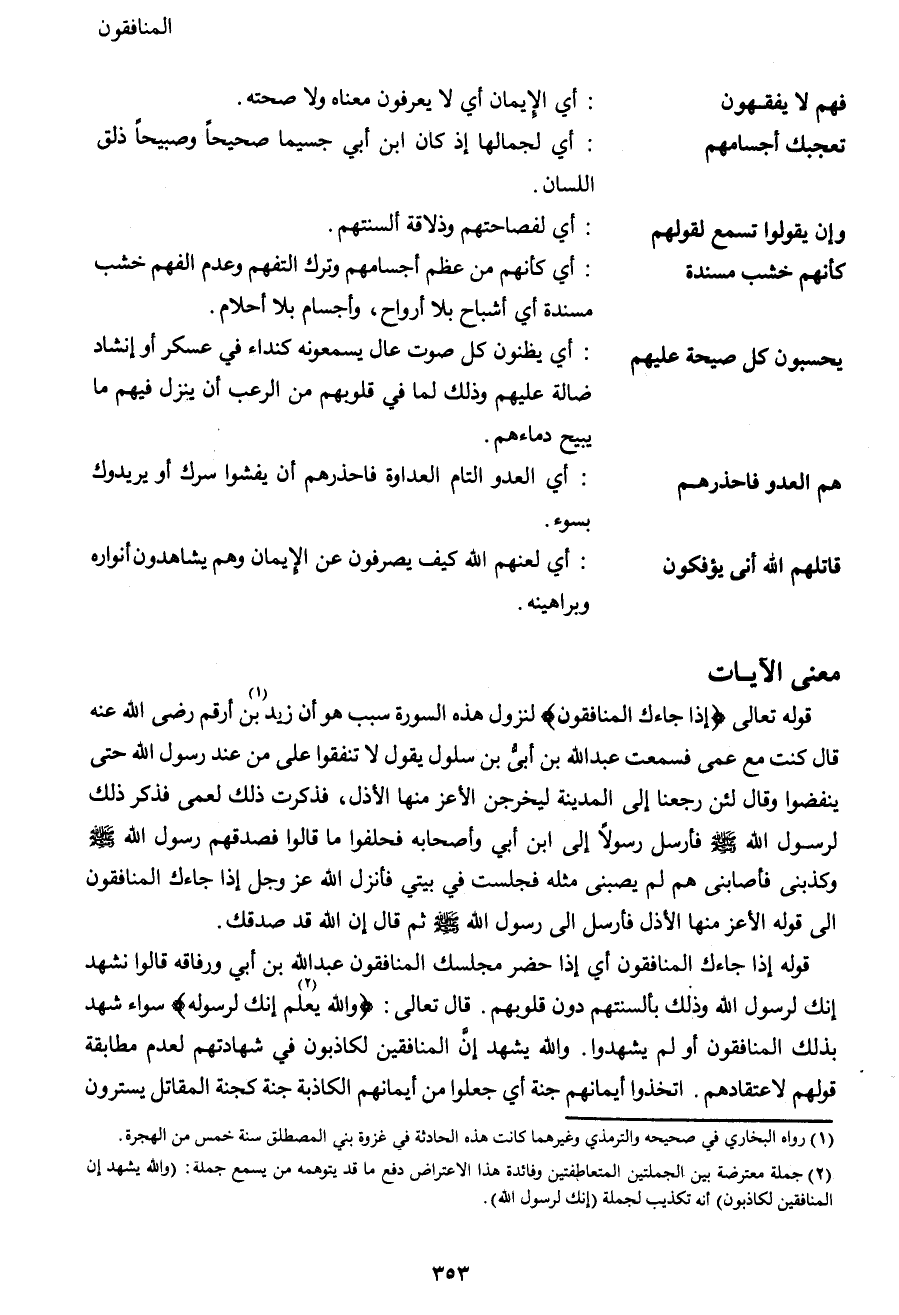 قوله إذا جاءك المنافقون أي إذا حضر مجلسك المنافقون عبد الله بن أبي ورفاقه قالوا نشهد إنك لرسول الله وذلك بألسنتهم دون قلوبهم. قال تعالى: {وَاللهُ يَعْلَمُ2 إِنَّكَ لَرَسُولُهُ} سواء شهد بذلك المنافقون أو لم يشهدوا. والله يشهد إن المنافقين لكاذبون في شهادتهم لعدم مطابقة قولهم لاعتقادهم. اتخذوا أيمانهم جنة أي جعلوا من أيمانهم الكاذبة جنة كجنة المقاتل يسترون