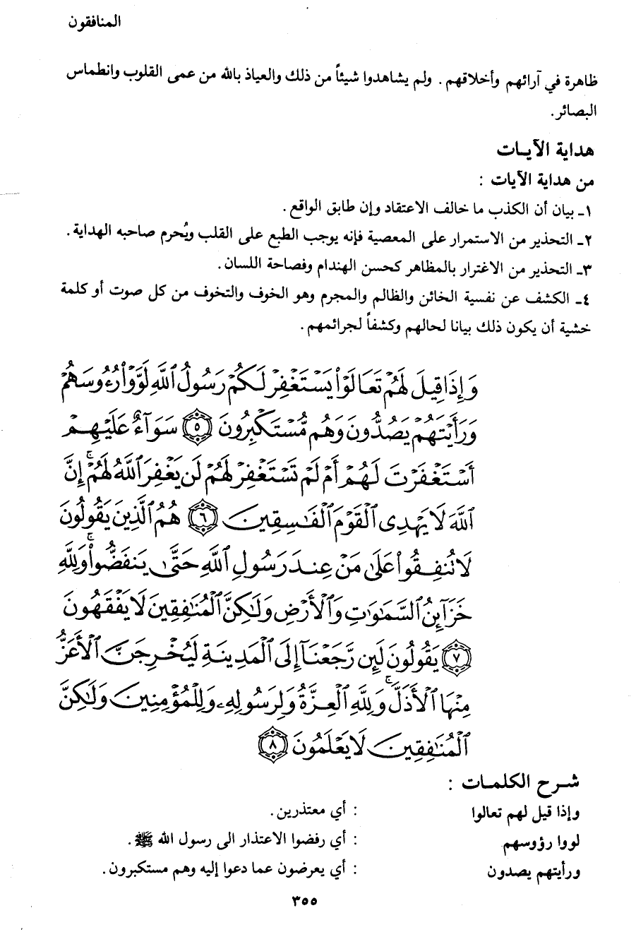 وَإِذَا قِيلَ لَهُمْ تَعَالَوْا يَسْتَغْفِرْ لَكُمْ رَسُولُ اللهِ لَوَّوْا رُؤُوسَهُمْ وَرَأَيْتَهُمْ يَصُدُّونَ وَهُمْ مُسْتَكْبِرُونَ (5) سَوَاءٌ عَلَيْهِمْ أَسْتَغْفَرْتَ لَهُمْ أَمْ لَمْ تَسْتَغْفِرْ لَهُمْ لَنْ يَغْفِرَ اللهُ لَهُمْ إِنَّ اللهَ لا يَهْدِي الْقَوْمَ الْفَاسِقِينَ (6) هُمُ الَّذِينَ يَقُولُونَ لا تُنْفِقُوا عَلَى مَنْ عِنْدَ رَسُولِ اللهِ حَتَّى يَنْفَضُّوا وَلِلَّهِ خَزَائِنُ السَّمَاوَاتِ وَالْأَرْضِ وَلَكِنَّ الْمُنَافِقِينَ لا يَفْقَهُونَ (7) يَقُولُونَ لَئِنْ رَجَعْنَا إِلَى الْمَدِينَةِ لَيُخْرِجَنَّ الْأَعَزُّ مِنْهَا الْأَذَلَّ وَلِلَّهِ الْعِزَّةُ وَلِرَسُولِهِ وَلِلْمُؤْمِنِينَ وَلَكِنَّ الْمُنَافِقِينَ لا يَعْلَمُونَ (8)
