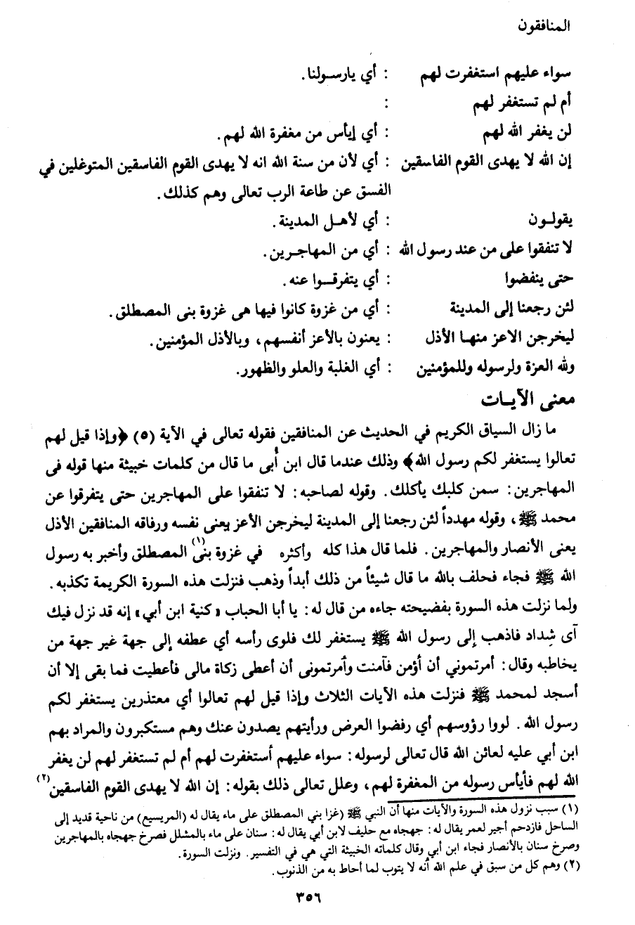 1 سبب نزول هذه السورة والآيات منها أن النبي صَلَّى اللهُ عَلَيْهِ وَسَلَّمَ (غزا بني المصطلق على ماء يقال له (المريسيع) من ناحية قديد إلى الساحل فازدحم أجير لعمر يقال له: جهجاه مع حليف لابن أبي يقال له: سنان على ماء بالمشلل فصرخ جهجاه بالمهاجرين وصرخ سنان بالأنصار فجاء ابن أبي وقال كلماته الخبيثة التي هي في التفسير. ونزلت السورة.