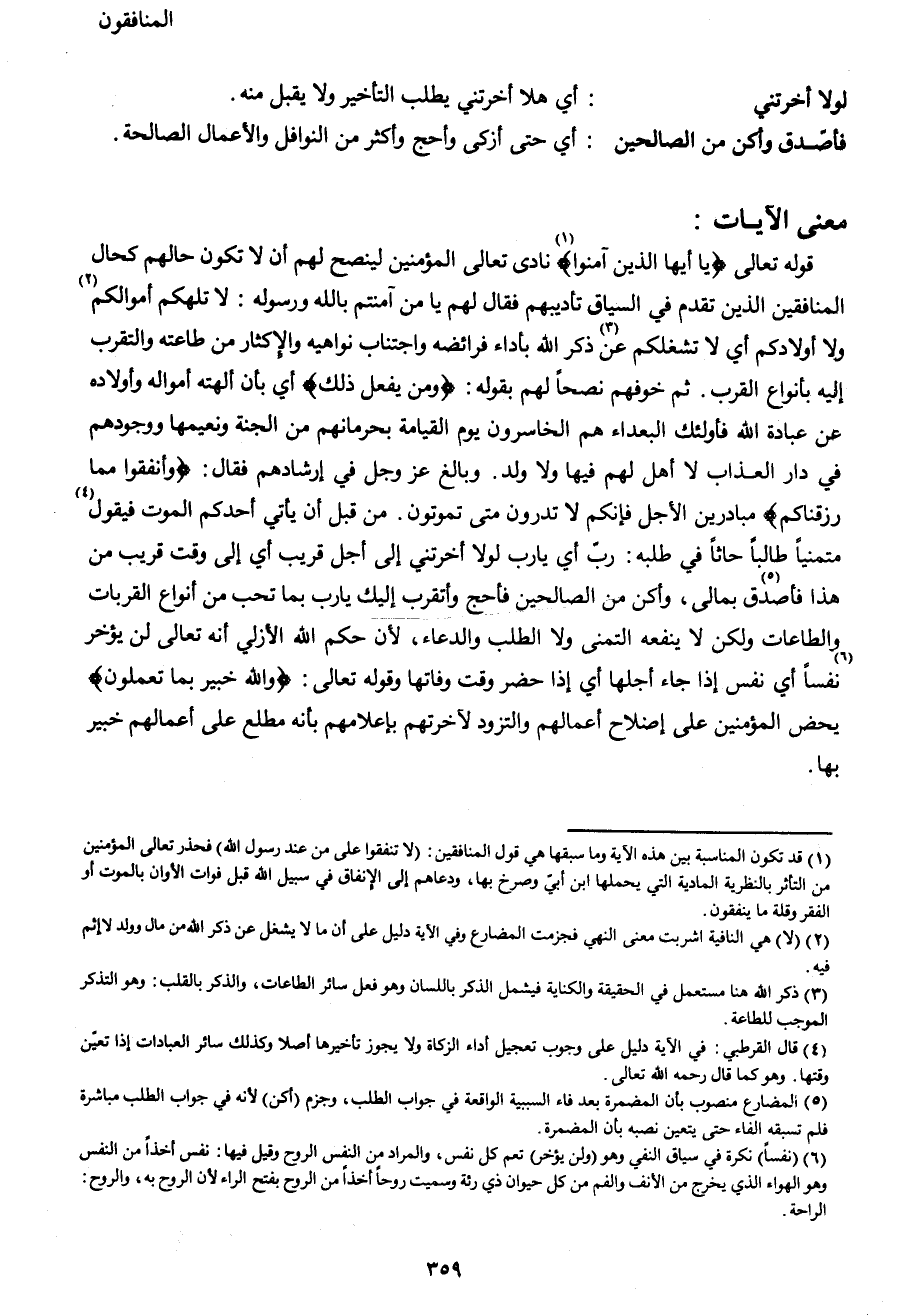 1 قد تكون المناسبة بين هذه الآية وما سبقها هي قول المنافقين: (لا تنفقوا على من عند رسول الله) فحذر تعالى المؤمنين من التأثر بالنظرية المادية التي يحملها ابن أبي وصرخ بها، ودعاهم إلى الإنفاق في سبيل الله قبل فوات الأوان بالموت أو الفقر وقلة ما ينفقون.