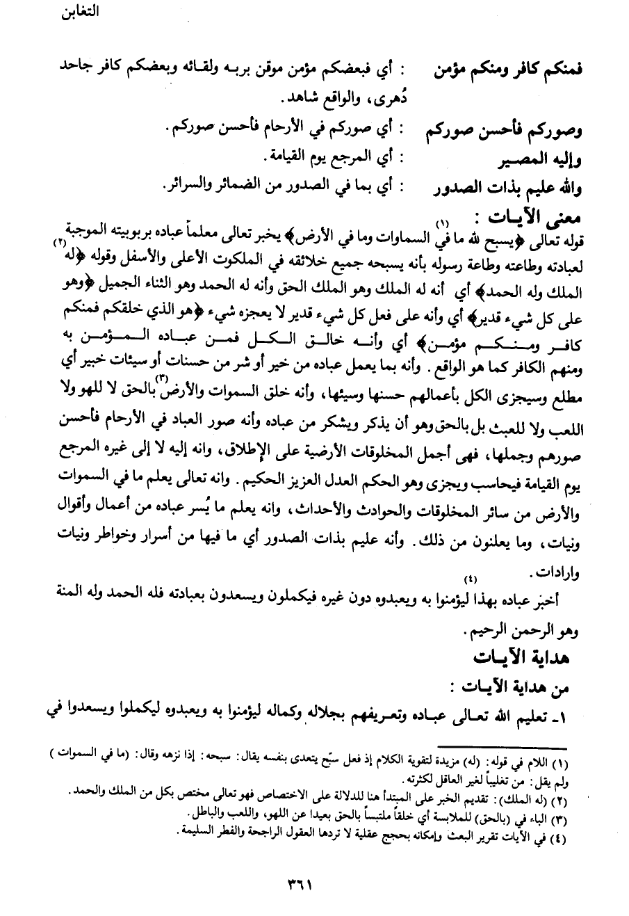 قوله تعالى {يُسَبِّحُ لِلَّهِ مَا فِي1 السَّمَاوَاتِ وَمَا فِي الْأَرْضِ} يخبر تعالى معلماً عباده بربوبيته الموجبة لعبادته وطاعته وطاعة رسوله بأنه يسبحه جميع خلائقه في الملكوت الأعلى والأسفل وقوله {لَهُ2 الْمُلْكُ وَلَهُ الْحَمْدُ} أي أنه له الملك وهو الملك الحق وأنه له الحمد وهو الثناء الجميل {وَهُوَ عَلَى كُلِّ شَيْءٍ قَدِيرٌ} أي وأنه على فعل كل شيء قدير لا يعجزه شيء {هُوَ الَّذِي خَلَقَكُمْ فَمِنْكُمْ كَافِرٌ وَمِنْكُمْ مُؤْمِنٌ} أي وأنه خالق الكل فمن عباده المؤمن به ومنهم لكافر كما هو الواقع. وأنه بما يعمل عباده من خير أو شر من حسنات أو سيئات خبير أي مطلع وسيجزى الكل بأعمالهم حسنها وسيئها، وأنه خلق السموات والأرض3 بالحق لا للهو ولا اللعب وللعبث بل بالحق وهو أن يذكر ويشكر من عباده وأنه صور العباد في الأرحام فأحسن صورهم وجملها، فهي أجمل المخلوقات الأرضية على الإطلاق، وأنه إليه لا إلى غيره المرجع يوم القيامة فيحاسب ويجزي وهو الحكم العدل العزيز الحكيم. وأنه تعالى يعلم ما في السموات والأرض من سائر المخلوقات والحوادث والأحداث، وأنه يعلم ما يسر عباده من أعمال وأقوال ونيات، وما يعلنون من ذلك. وأنه عليم بذات الصدور أي ما فيها من أسرار وخواطر ونيات وإرادات.