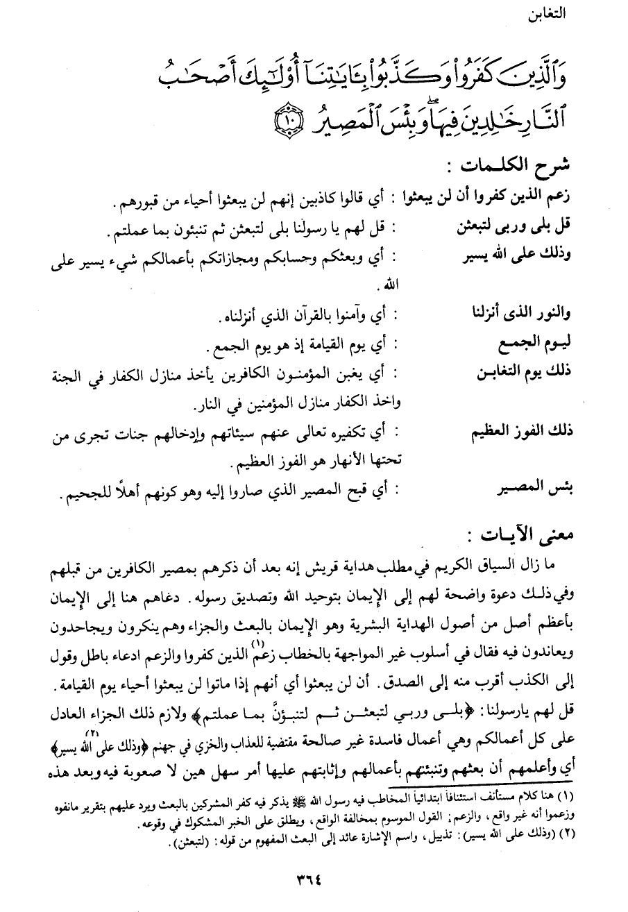 ما زال السياق الكريم في مطلب هداية قريش إنه بعد أن ذكرهم بمصير الكافرين من قبلهم وفي ذلك دعوة واضحة لهم إلى الإيمان بتوحيد الله وتصديق رسوله. دعاهم هنا إلى الإيمان بأعظم أصل من أصول الهداية البشرية وهو الإيمان بالبعث والجزاء وهم ينكرون ويجاحدون ويعاندون قيه فقال في أسلوب غير المواجهة بالخطاب زعم1 الذين كفروا والزعم ادعاء باطل وقول إلى الكذب أقرب منه إلى الصدق. أن لن يبعثوا أي أنهم إذا ماتوا لن يبعثوا أحياء يوم القيامة.