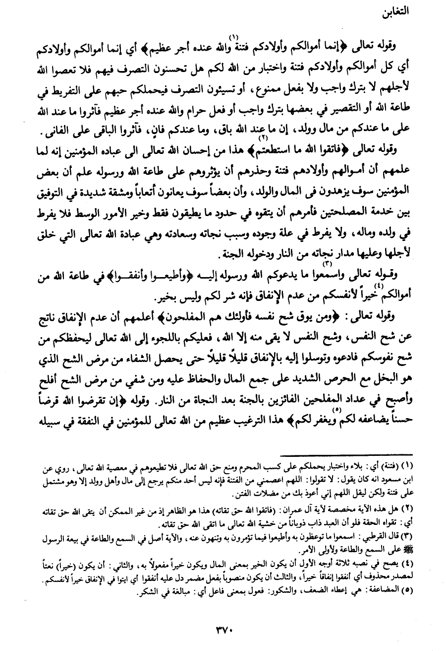 وقوله تعالى {إِنَّمَا أَمْوَالُكُمْ وَأَوْلادُكُمْ فِتْنَةٌ1 وَاللهُ عِنْدَهُ أَجْرٌ عَظِيمٌ} أي إنما أموالكم وأولادكم أي كل أموالكم وأولادكم فتنة واختبار من الله لكم هل تحسنون التصرف فيهم فلا تعصوا الله لأجلهم لا بترك واجب ولا بفعل ممنوع, أو تسيئون التصرف فيحملكم حبهم على التفريط في طاعة الله أو التقصير في بعضها بترك واجب أو فعل حرام والله عنده أجر عظيم فآثروا ما عند الله على ما عندكم من مال وولد, إن ما عند الله باق, وما عندكم فانٍ, فآثروا الباقي على الفاني.