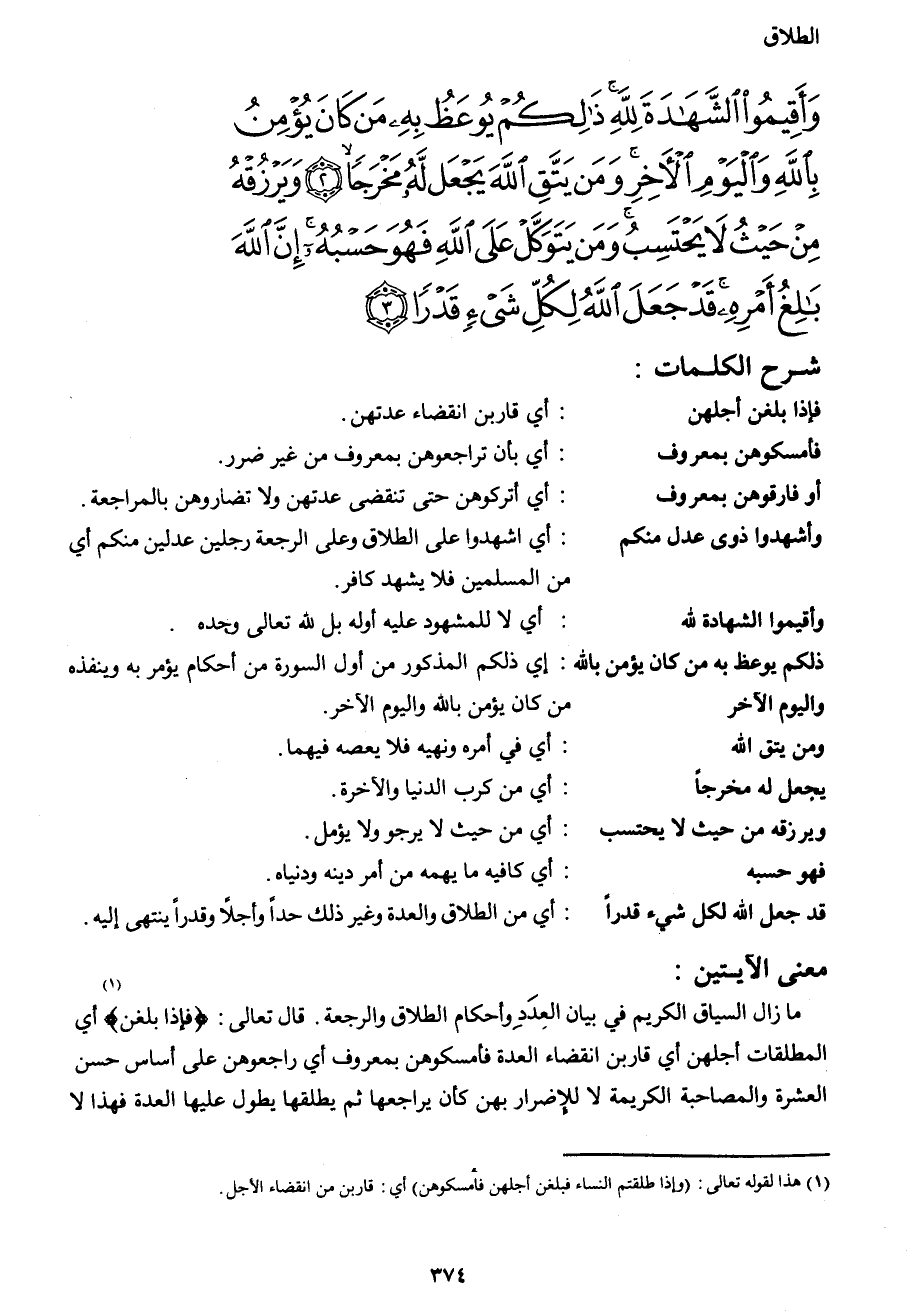 وَأَقِيمُوا الشَّهَادَةَ لِلَّهِ ذَلِكُمْ يُوعَظُ بِهِ مَنْ كَانَ يُؤْمِنُ بِاللهِ وَالْيَوْمِ الْآخِرِ وَمَنْ يَتَّقِ اللهَ يَجْعَلْ لَهُ مَخْرَجاً (2) وَيَرْزُقْهُ مِنْ حَيْثُ لا يَحْتَسِبُ وَمَنْ يَتَوَكَّلْ عَلَى اللهِ فَهُوَ حَسْبُهُ إِنَّ اللهَ بَالِغُ أَمْرِهِ قَدْ جَعَلَ اللهُ لِكُلِّ شَيْءٍ قَدْراً (3)