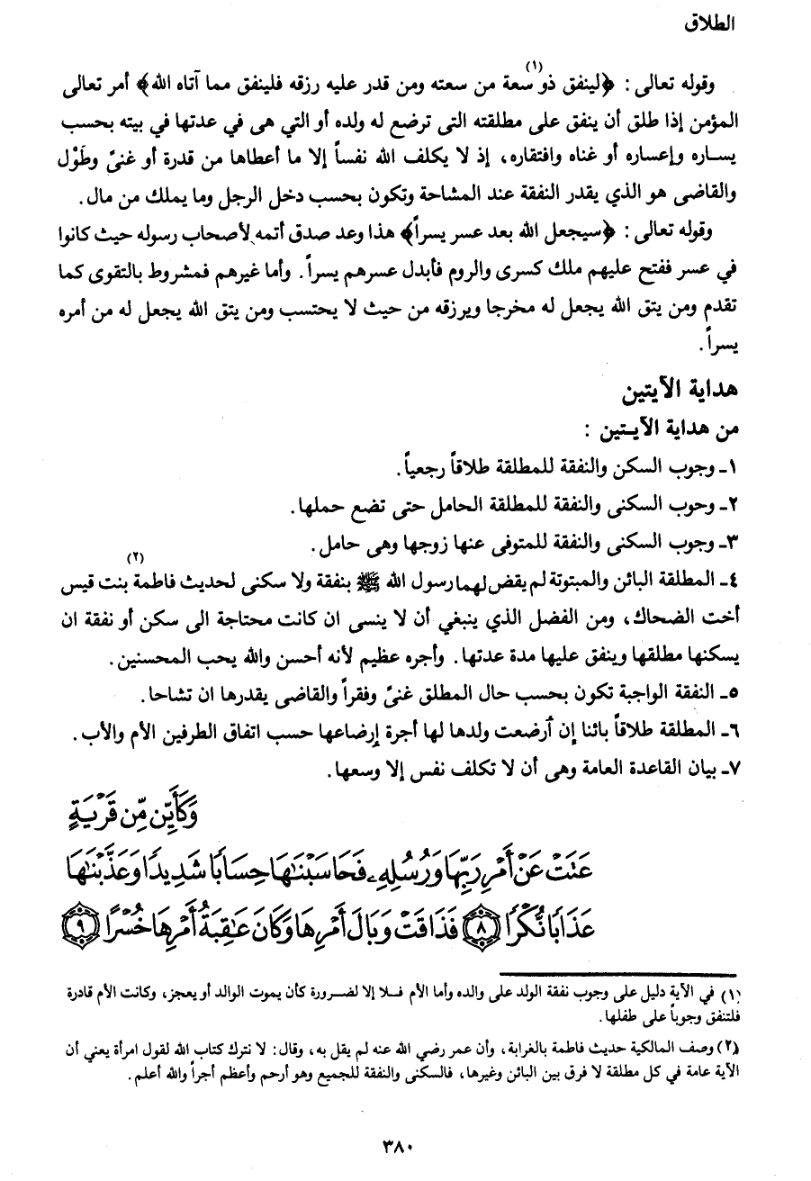 وقوله تعالى: {لِيُنْفِقْ ذُو1 سَعَةٍ مِنْ سَعَتِهِ وَمَنْ قُدِرَ عَلَيْهِ رِزْقُهُ فَلْيُنْفِقْ مِمَّا آتَاهُ اللهُ} أمر تعالى المؤمن إذا طلق أن ينفق على مطلقته التي ترضع له ولده أو التي هي في عدتها في بيته بحسب يساره أو إعساره أو غناه وافتقاره، إذ ى يكلف الله نفساً إلا ما أعطاها من قدرة أو غنىً وطول والقاضي هو الذي يقدر النفقة عند المشاحنة وتكون بحسب دخل الرجل وما يملك من مال.