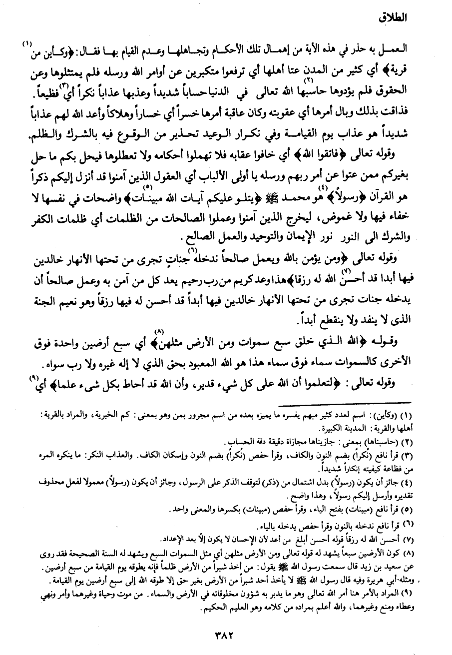 العمل به حذر في هذه الآية من إهمال تلك الأحكام وتجاهلها وعدم القيام بها فقال: {وَكَأَيِّنْ مِنْ1 قَرْيَةٍ} أي كثير من المدن عتا أهلها أي ترفعوا متكبرين عن أوامر الله ورسله فلم يمتثلوها وعن الحقوق فلم يؤدوها حاسبها2 الله تعالى في الدنيا حساباً شديداً وعذبها عذاباً نكراً أي3 فظيعاً. فذاقت بذلك وبال أمرها أي عقوبته وكان عاقبة أمرها خسراً أي خساراً وهلاكاً وأعد الله لهم عذاباً شديداً هو عذاب يوم القيامة وفي تكرار الوعيد تحذير من الوقوع فيه بالشرك والظلم. وقوله تعالى {فَاتَّقُوا اللهَ} أي خافوا عقابه فلا تهملوا أحكامه ولا تعطلوها فيحل بكم ما حل بغيركم ممن عتوا عن أمر ربهم ورسله يا أولي الألباب أي العقول الذين آمنوا قد أنزل إليكم ذكراً هو القرآن {رَسُولاً} 4 هو محمد صَلَّى اللهُ عَلَيْهِ وَسَلَّمَ {يَتْلُو عَلَيْكُمْ آيَاتِ اللهِ مُبَيِّنَاتٍ5} واضحات في نفسها لا خفاء فيها ولا غموض، ليخرج الذين آمنوا وعملوا الصالحات من الظلمات أي ظلمات الكفر والشرك إلى النور نور الإيمان والتوحيد والعمل الصالح.