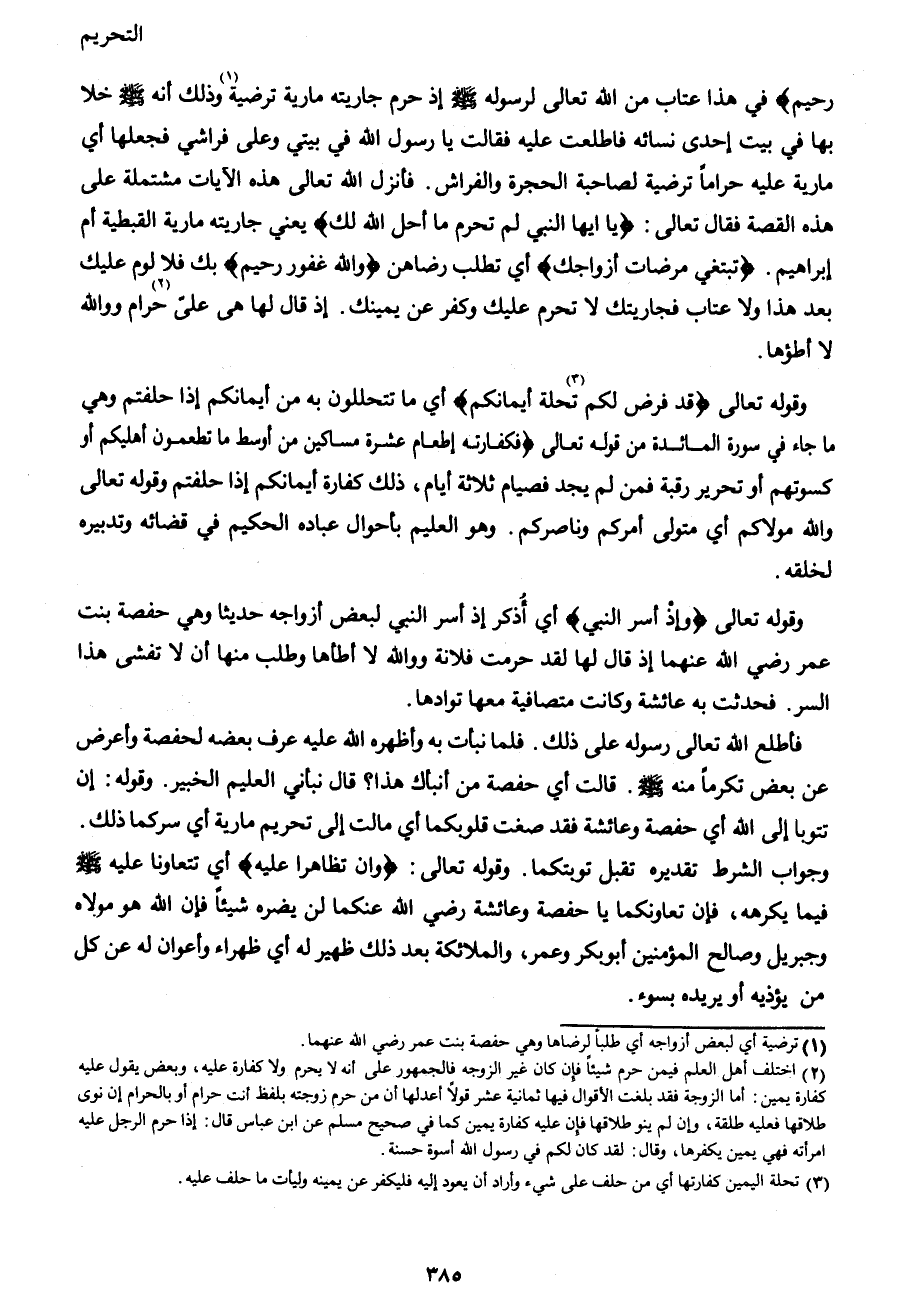 رَحِيمٌ} في هذا عتاب من الله تعالى لرسوله صَلَّى اللهُ عَلَيْهِ وَسَلَّمَ إذ حرم جاريته مارية ترضية1 وذلك أنه صَلَّى اللهُ عَلَيْهِ وَسَلَّمَ خلا بها في بيت إحدى نسائه فاطلعت عليه فقالت يا رسول الله في بيتي وعلى فراشي فجعلها أي مارية عليه حراماً ترضية لصاحبة الحجرة والفراش. فأنزل الله تعالى هذه الآيات مشتملة على هذه القصة فقال تعالى: {يَا أَيُّهَا النَّبِيُّ لِمَ تُحَرِّمُ مَا أَحَلَّ اللهُ لَكَ} يعني جاريته مارية القبطية أم إبراهيم. {تَبْتَغِي مَرْضَاتَ أَزْوَاجِكَ} أي تطلب رضاهن {وَاللهُ غَفُورٌ رَحِيمٌ} بك فلا لوم عليك بعد هذا ولا عتاب فجاريتك لا تحرم عليك وكفر عن يمينك. إذ قال لها هي علي 2حرام ووالله لا أطؤها.