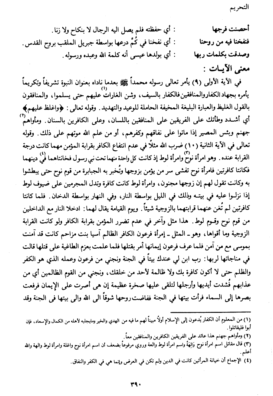 في الآية الأولى (9) يأمر تعالى رسوله محمداً صَلَّى اللهُ عَلَيْهِ وَسَلَّمَ بعدما ناداه بعنوان النبوة تشريفاً وتكريماً يأمره بجهاد الكفار والمنافقين فالكفار بالسيف، وشن الغارات1 عليهم حتى يسلموا، والمنافقون بالقول الغليظ والعبارة البليغة المخيفة الحاملة للوعيد والتهديد. وقوله تعالى: {وَاغْلُظْ عَلَيْهِمْ} أي أشدد وطأتك على الفريقين على المنافقين باللسان، وعلى الكافرين بالسنان. ومأواهم2 جهنم وبئس المصير إذا ماتوا على نفاقهم وكفرهم، أو من علم الله موتهم على ذلك. وقوله تعالى في الآية الثانية (10) ضرب الله مثلاً في عدم انتفاع الكافر بقرابة المؤمن مهما كانت درجة القرابة عنده. وهو امرأة نوح3 وامرأة لوط إذ كانت كل واحدة منهما تحت نبي رسول فخانتاهما في4 دينهما فكانتا كافرتين فامرأة نوح تفشي سر من يؤمن بزوجها وتخبر به الجبابرة من قوم نوح حتى يبطشوا به وكانت تقول لهم إن زوجها مجنون، وامرأة لوط كانت كافرة وتدل المجرمين على ضيوف لوط إذا نزلوا عليه في بيته وذلك في الليل بواسطة النار، وفي النهار بواسطة الدخان. فلما كانتا كافرتين لم تغن عنهما قرابتهما بالزوجية شيئاً. ويوم القيامة يقال لهما: ادخلا النار مع الداخلين من قوم نوح وقوم لوط. هذا مثل آخر في عدم تضرر المؤمن بقرابة الكافر ولو كانت القرابة الزوجية وما أقواها، وهو –المثل- امرأة فرعون الكافر الظالم آسيا بنت مزاحم كانت قد آمنت بموسى مع من آمن فلما عرف فرعون إيمانها أمر بقتلها فلما علمت بعزم الطاغية على قتلها قالت في مناجاتها لربها: رب ابن لي عندك بيتاً في الجنة ونجني من فرعون وعمله الذي هو الكفر والظلم حتى لا أكون كافرة بك ولا ظالمة لأحد من خلقك، ونجني من القوم الظالمين أي من عذابهم فشدت أيديها وأرجلها لتلقى عليها صخرة عظيمة إن هي أصرت على الإيمان فرفعت بصرها إلى السماء فرأت بيتها في الجنة ففاضت روحها شوقاً إلى الله وإلى بيتها في الجنة وقد